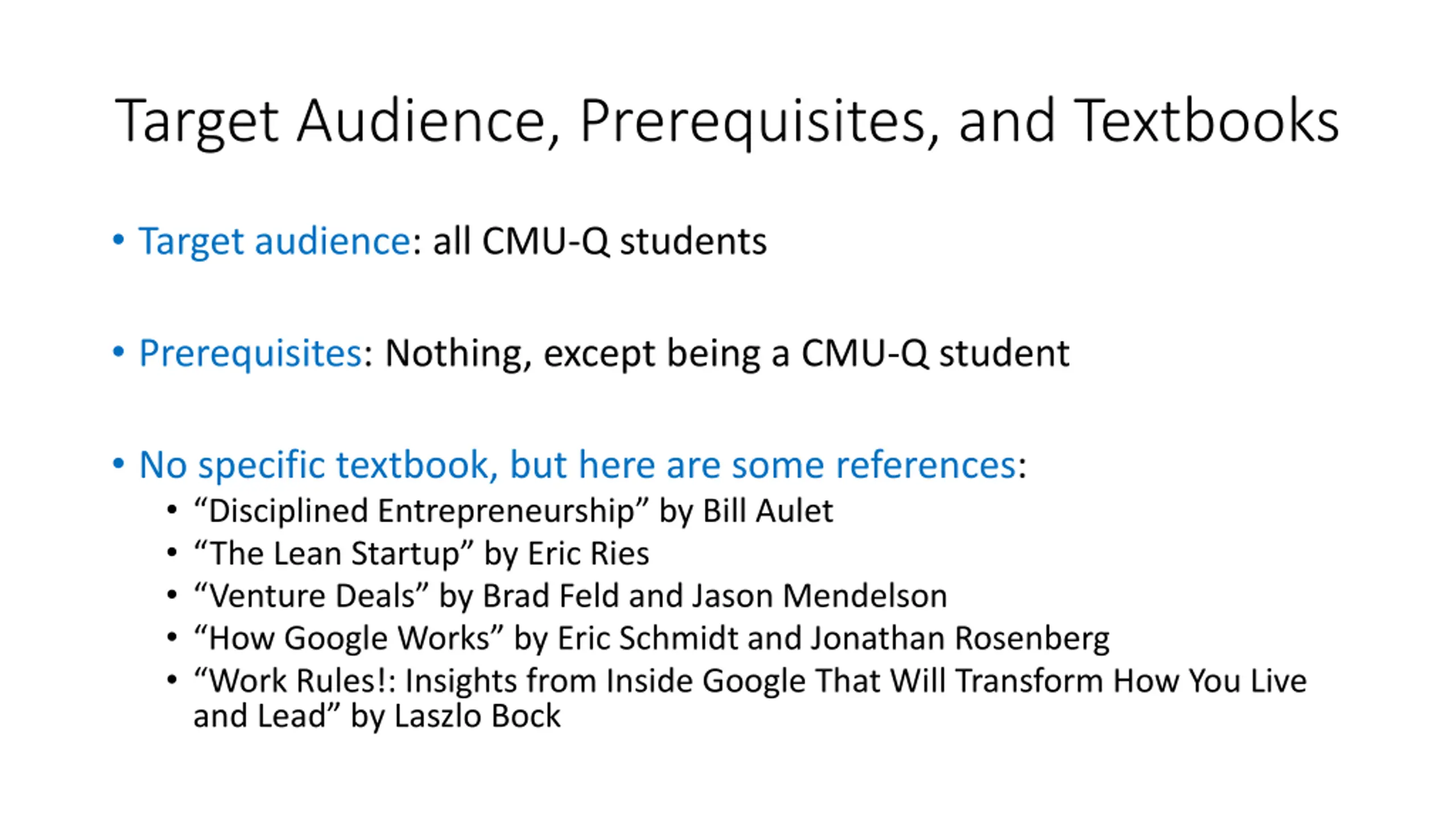 Target Audience, Prerequisites, and Textbooks Target audience: all CMU-Q students Prerequisites: Nothing, except being a CMU-Q student No specific textbook, but here are some references: Disciplined Entrepreneurship by Bill Aulet The Lean Startup by Eric Ries Venture Deals by Brad Feld and Jason Mendelson How Google Works by Eric Schmidt and Jonathan Rosenberg Work Rules!: Insights from Inside Google That Will Transform How You Live and Lead by Laszlo Bock