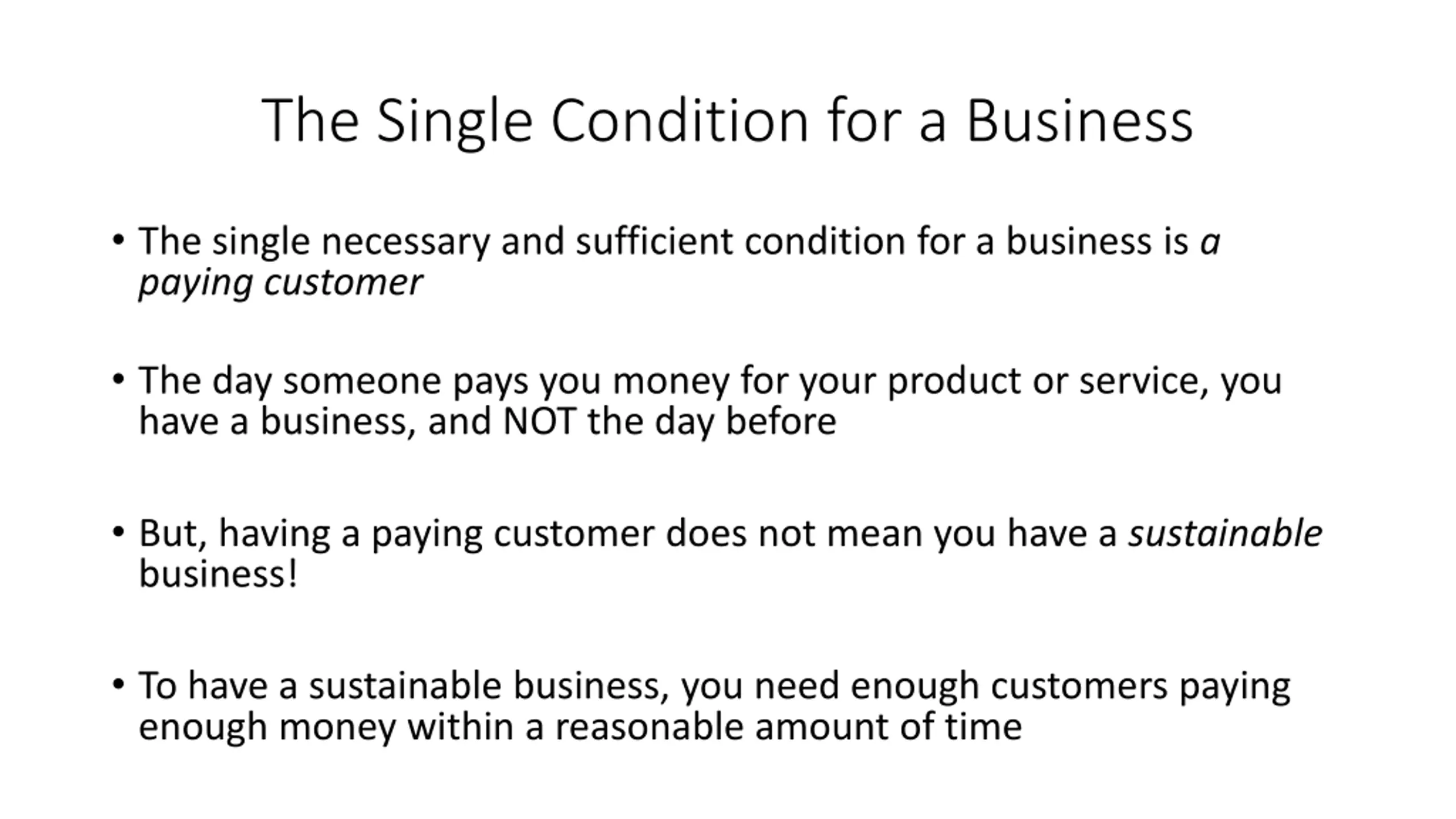 The Single Condition for a Business The single necessary and sufficient condition for a business is a paying customer The day someone pays you money for your product or service, you have a business, and NOT the day before But, having a paying customer does not mean you have a sustainable business! To have a sustainable business, you need enough customers paying enough money within a reasonable amount of time