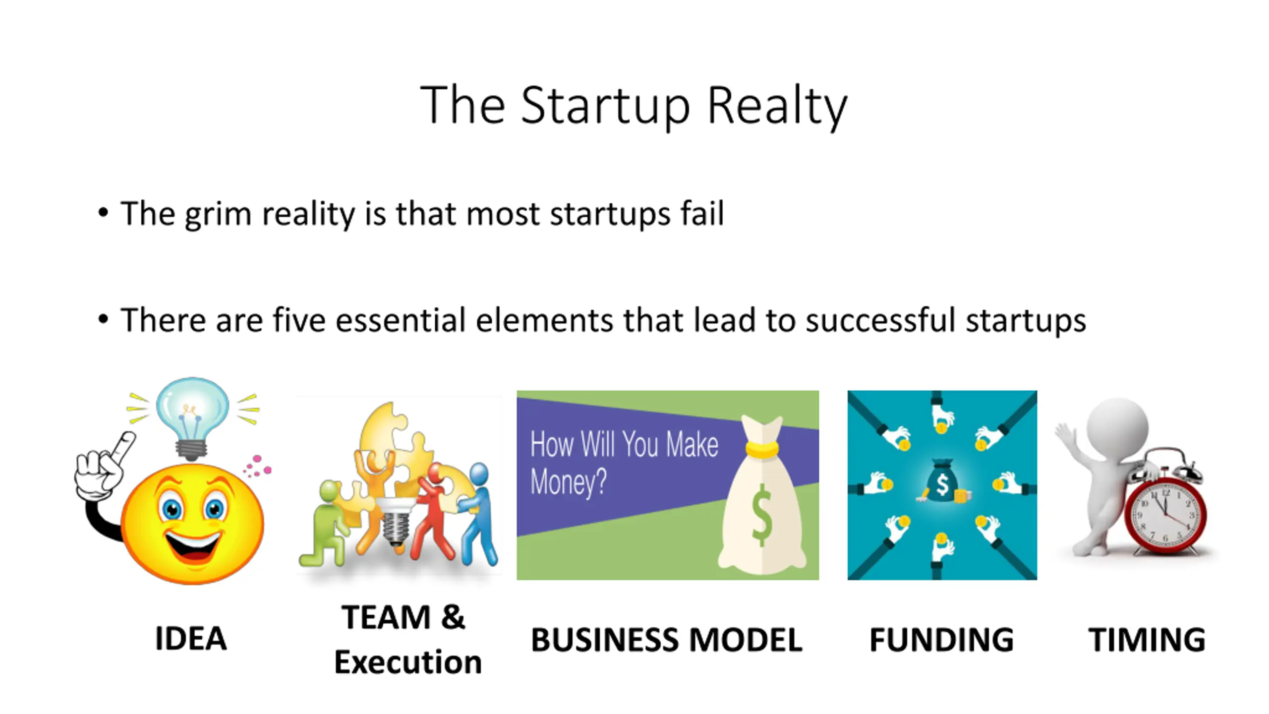 The Startup Realty The grim reality is that most startups fail There are five essential elements that lead to successful startups TEAM & Execution IDEA BUSINESS MODEL FUNDING TIMING