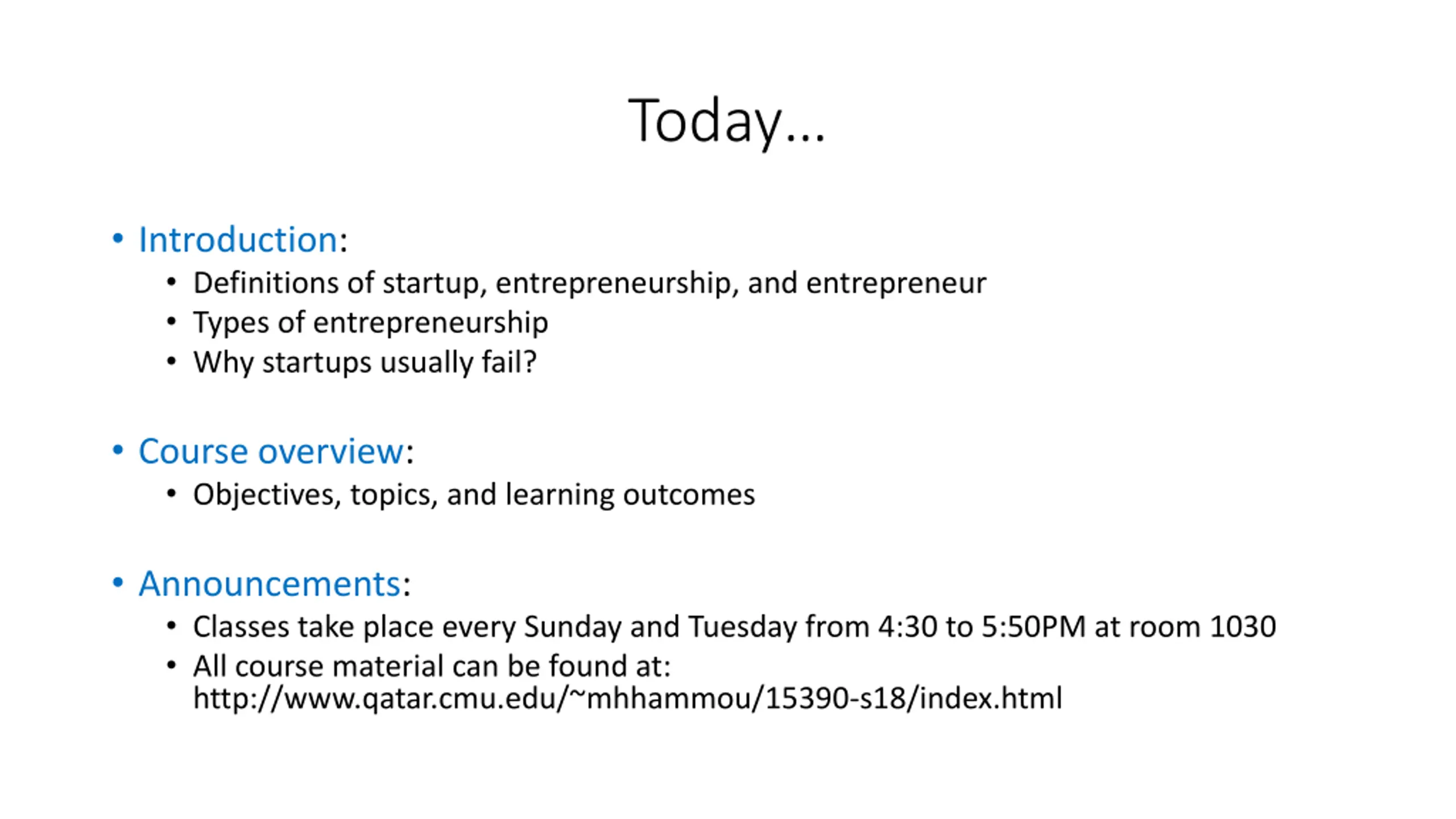 Today Introduction: Definitions of startup, entrepreneurship, and entrepreneur Types of entrepreneurship Why startups usually fail? Course overview: Objectives, topics, and learning outcomes Announcements: Classes take place every Sunday and Tuesday from 4:30 to 5:50PM at room 1030 All course material can be found at: http://www.qatar.cmu.edu/~mhhammou/15390-s18/index.html