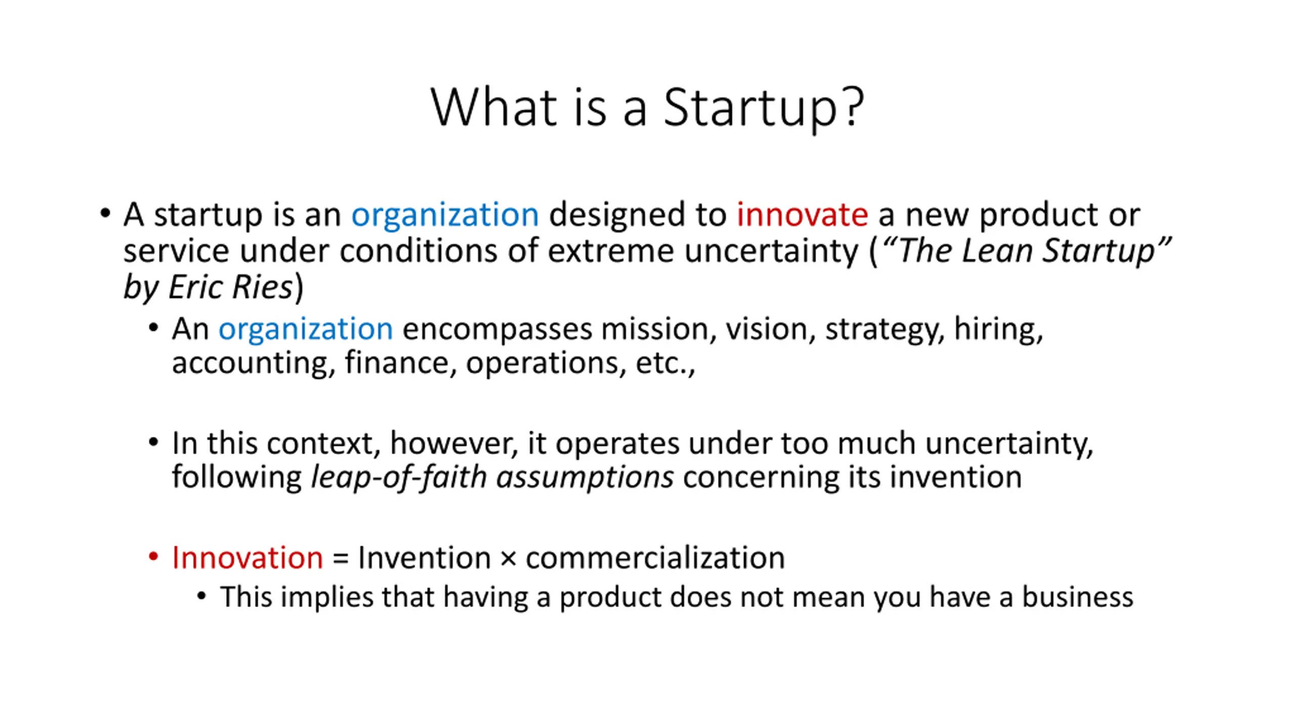 What is a Startup? A startup is an organization designed to innovate a new product or service under conditions of extreme uncertainty ( The Lean Startup by Eric Ries) An organization encompasses mission, vision, strategy, hiring, accounting, finance, operations, etc., In this context, however, it operates under too much uncertainty, following leap-of-faith assumptions concerning its invention Innovation = Invention commercialization This implies that having a product does not mean you have a business