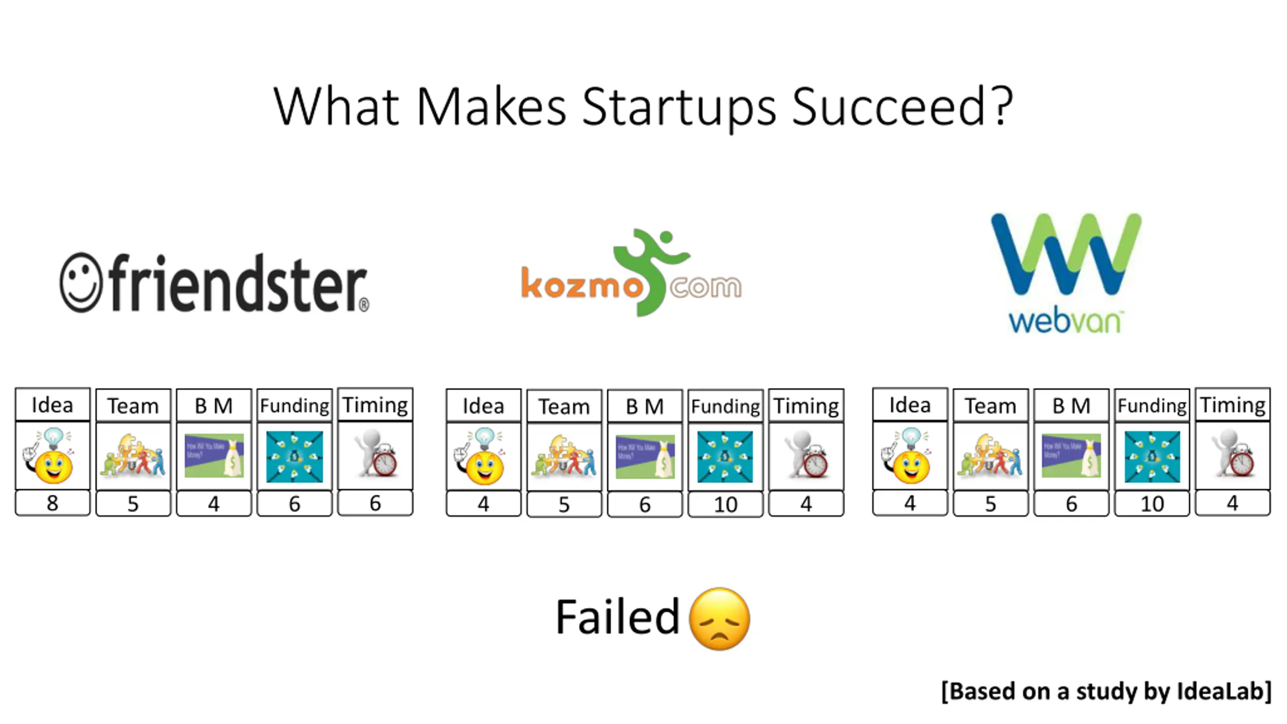 What Makes Startups Succeed? Idea Timing Idea Timing Team B M Idea Timing Team B M Team B M Funding Funding Funding 8 6 4 4 5 4 6 4 4 5 6 10 5 6 10 Failed [Based on a study by IdeaLab]
