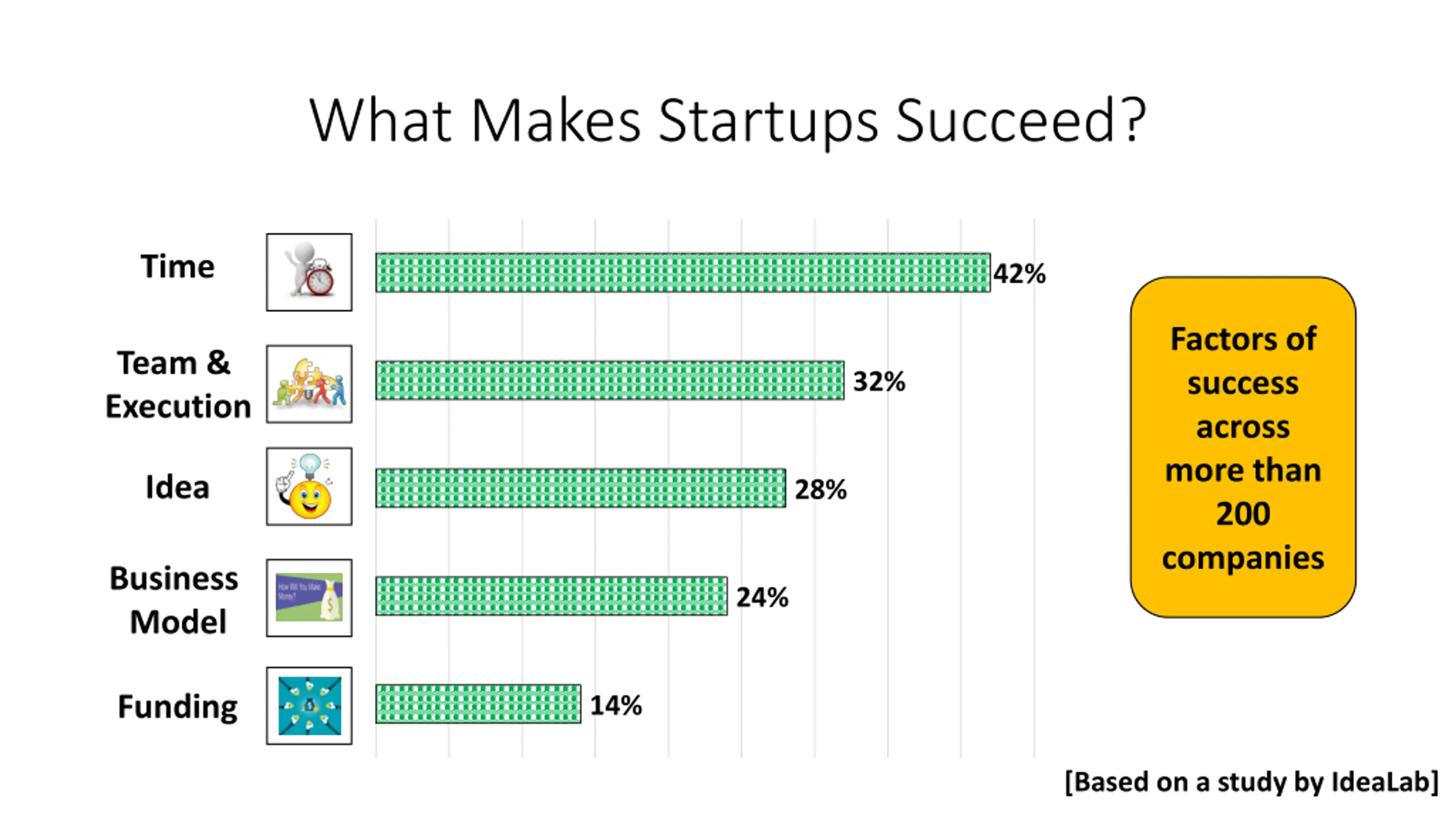 What Makes Startups Succeed? Factors In Success Across 200 Companies 42% 45% 40% 32% 35% 28% 30% 24% 25% 20% 14% 15% 10% 5% 0% Idea Team Bussiness Model Funding Timing [Based on a study by IdeaLab]