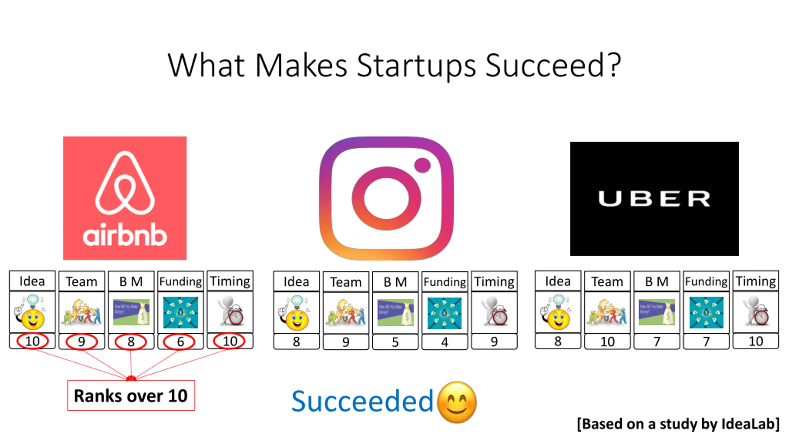 What Makes Startups Succeed? Idea Timing Idea Timing Team B M Idea Timing Team B M Team B M Funding Funding Funding 10 10 8 10 9 8 6 8 9 10 7 7 9 5 4 Succeeded Ranks over 10 [Based on a study by IdeaLab]