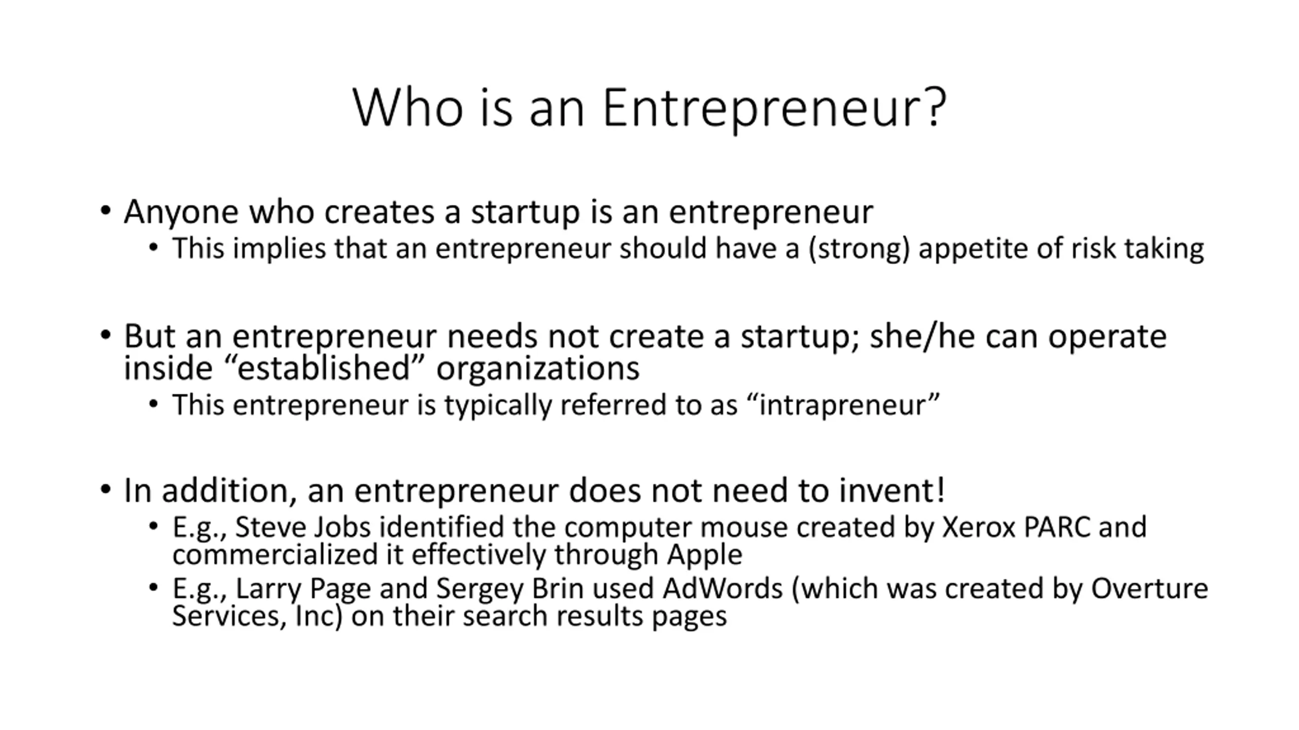 Who is an Entrepreneur? Anyone who creates a startup is an entrepreneur This implies that an entrepreneur should have a (strong) appetite of risk taking But an entrepreneur needs not create a startup; she/he can operate inside established organizations This entrepreneur is typically referred to as intrapreneur In addition, an entrepreneur does not need to invent! E.g., Steve Jobs identified the computer mouse created by Xerox PARC and commercialized it effectively through Apple E.g., Larry Page and Sergey Brin used AdWords (which was created by Overture Services, Inc) on their search results pages