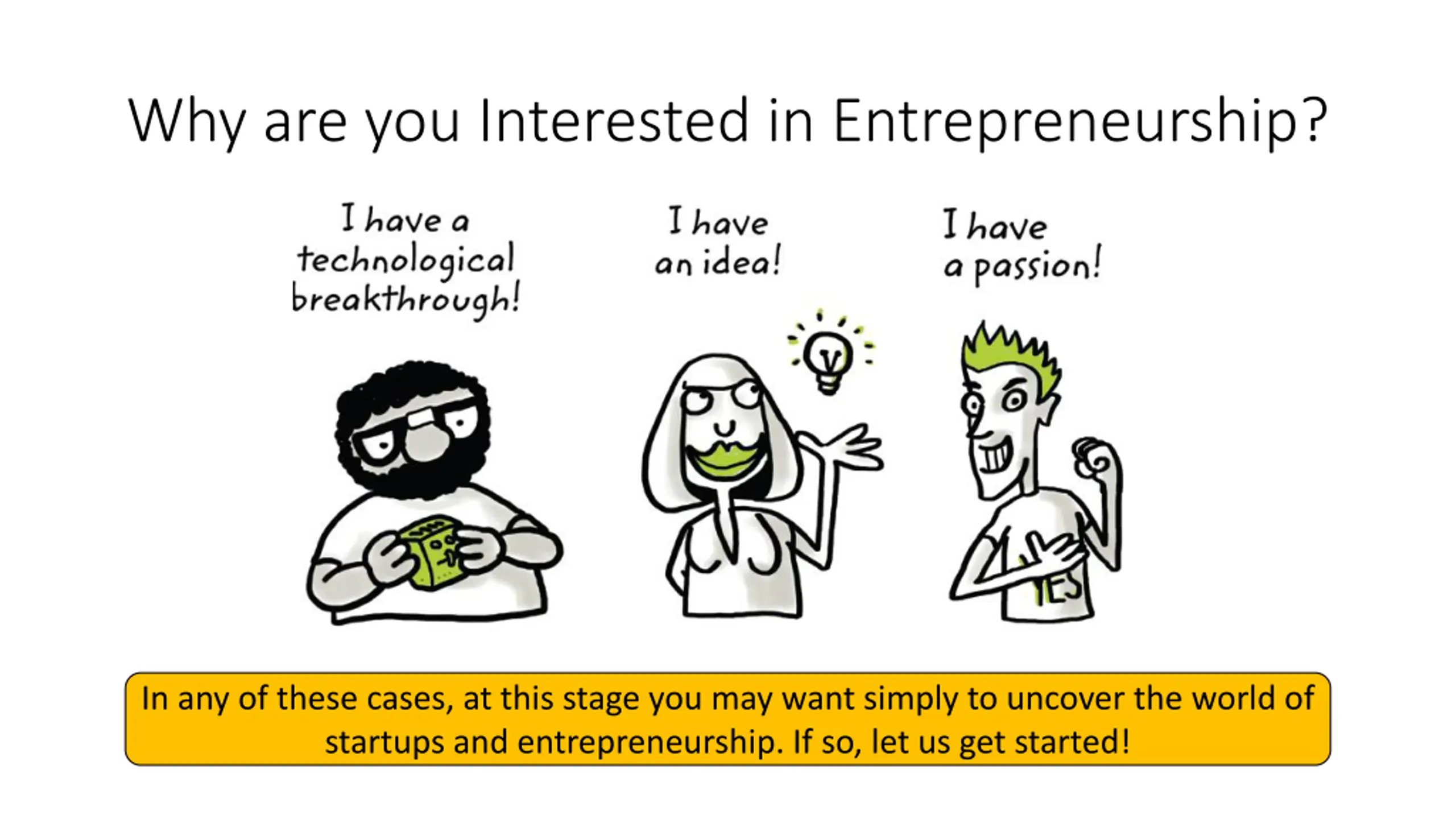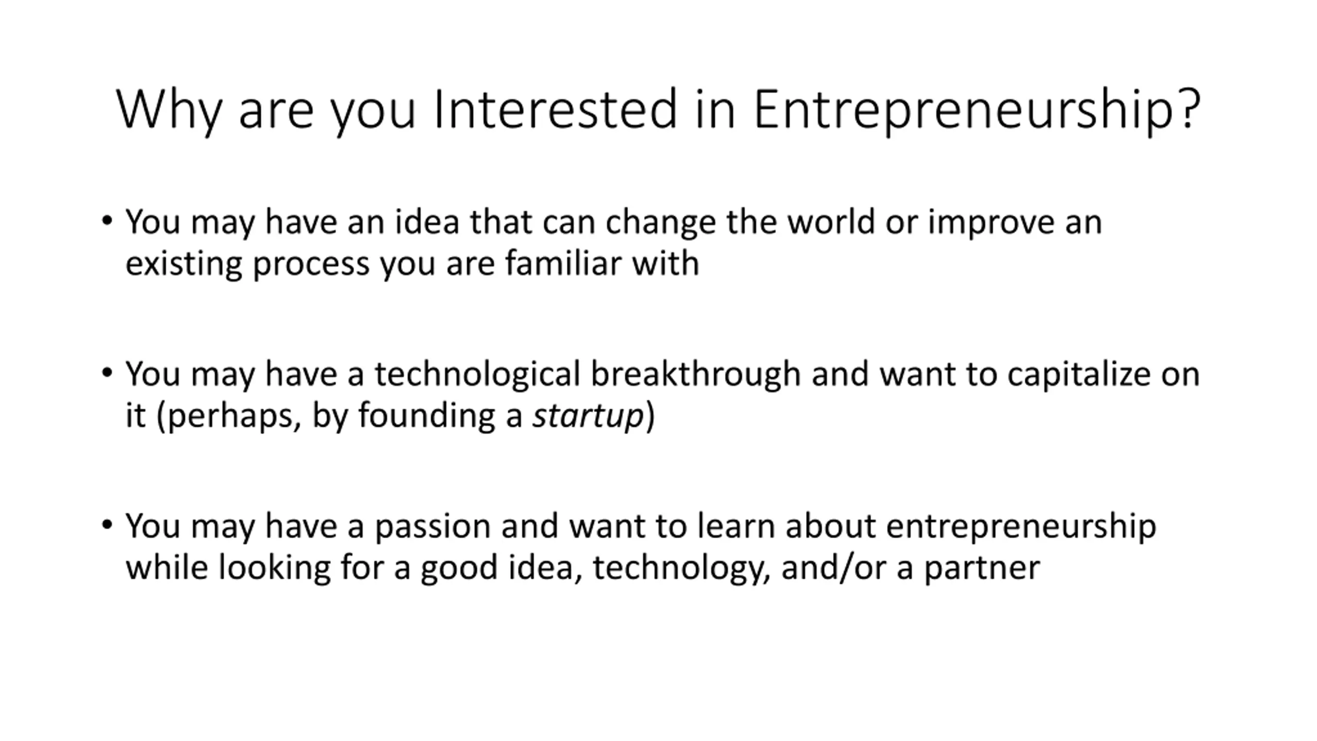 Why are you Interested in Entrepreneurship? You may have an idea that can change the world or improve an existing process you are familiar with You may have a technological breakthrough and want to capitalize on it (perhaps, by founding a startup) You may have a passion and want to learn about entrepreneurship while looking for a good idea, technology, and/or a partner