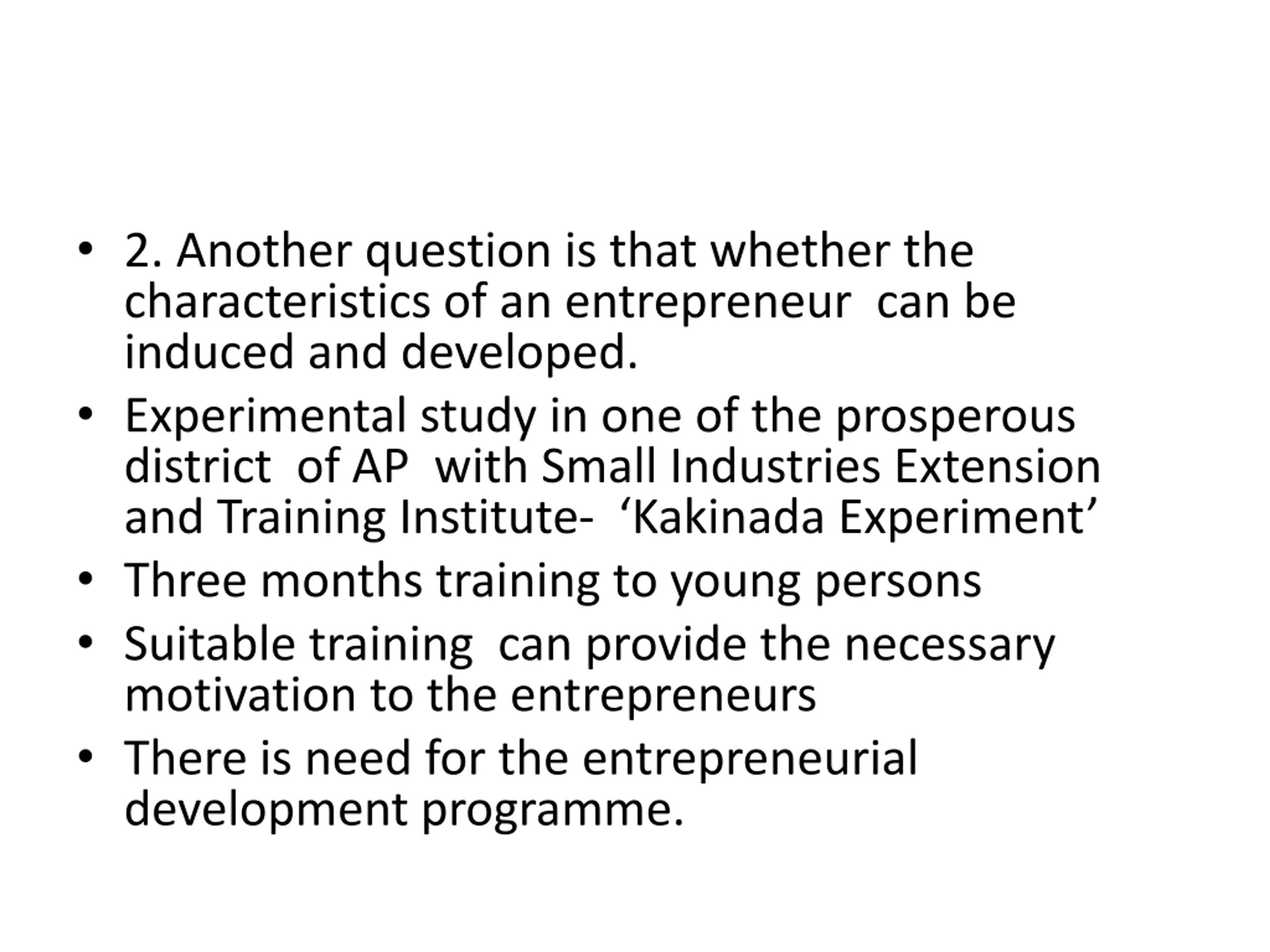 2. Another question is that whether the characteristics of an entrepreneur can be induced and developed. Experimental study in one of the prosperous district of AP with Small Industries Extension and Training Institute- Kakinada Experiment Three months training to young persons Suitable training can provide the necessary motivation to the entrepreneurs There is need for the entrepreneurial development programme.