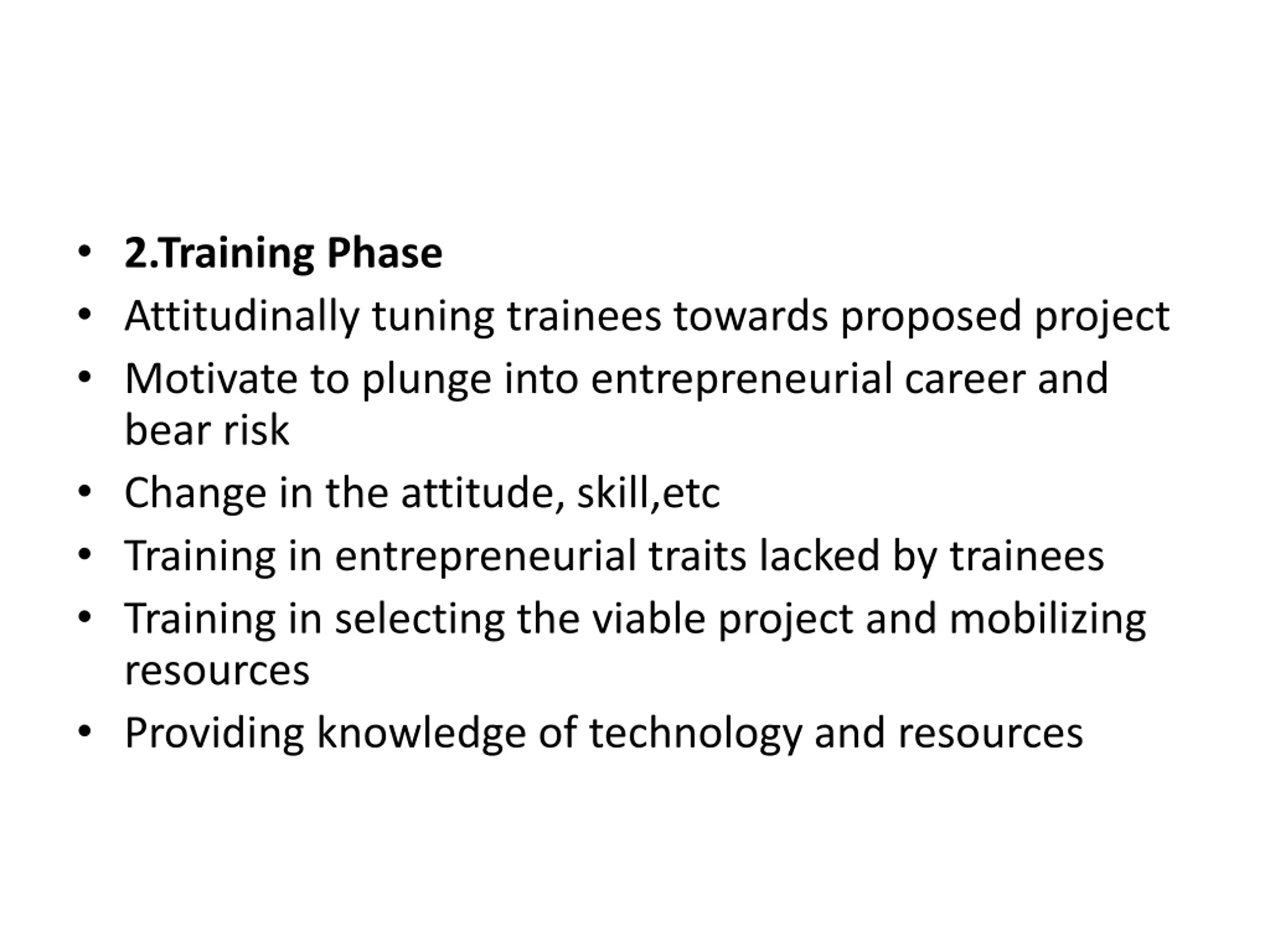 2.Training Phase Attitudinally tuning trainees towards proposed project Motivate to plunge into entrepreneurial career and bear risk Change in the attitude, skill,etc Training in entrepreneurial traits lacked by trainees Training in selecting the viable project and mobilizing resources Providing knowledge of technology and resources