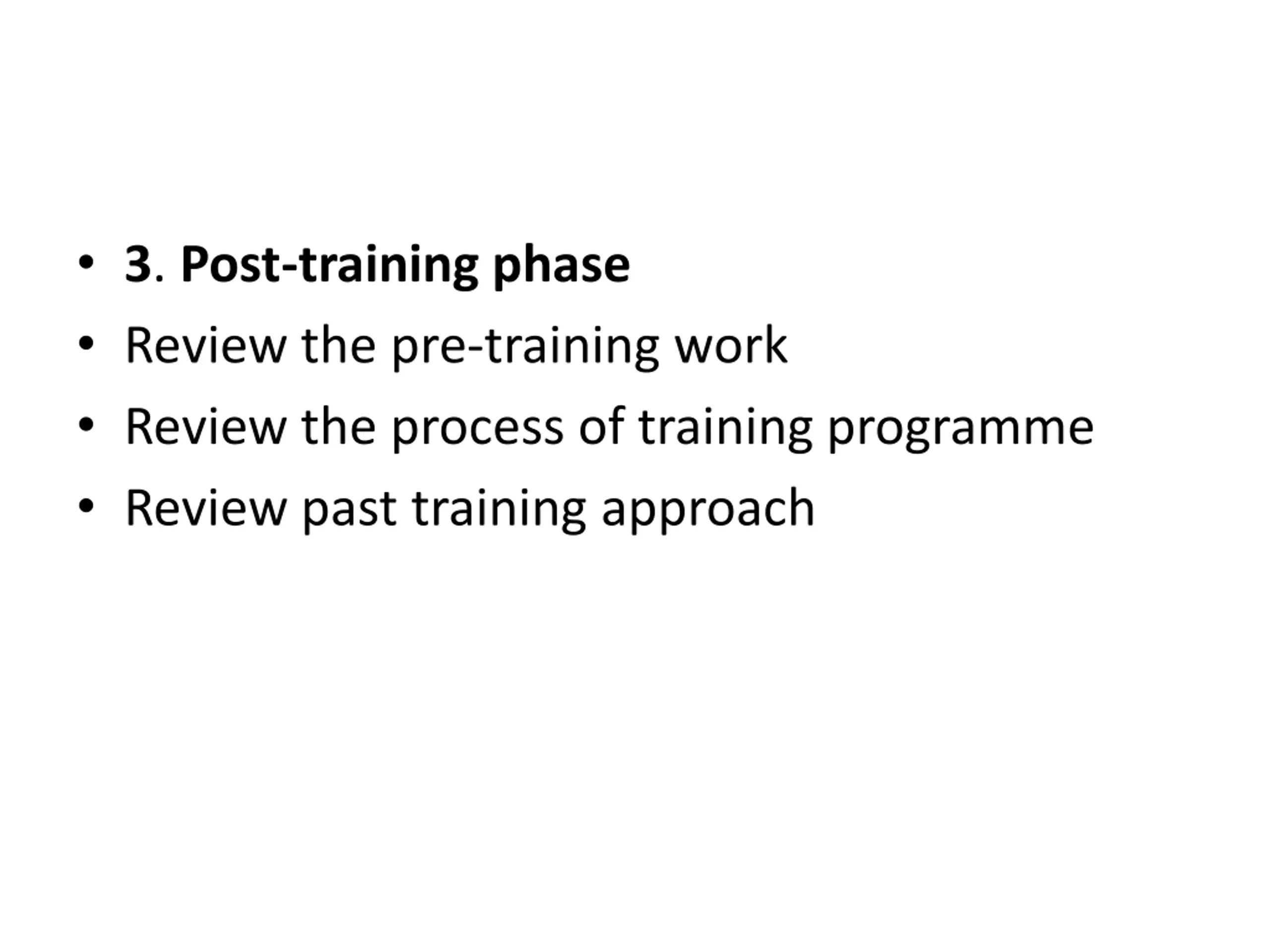 3. Post-training phase Review the pre-training work Review the process of training programme Review past training approach