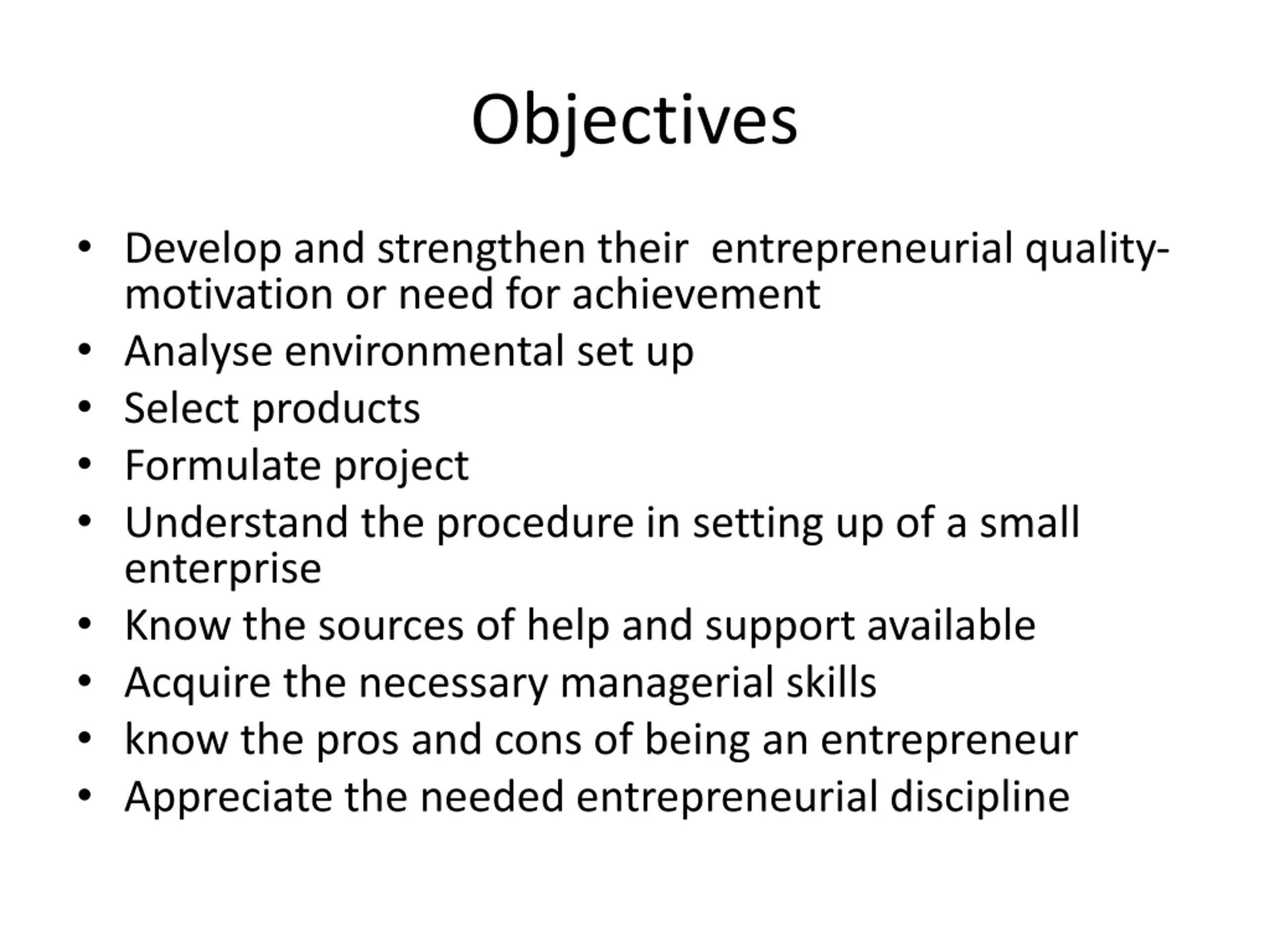 Objectives Develop and strengthen their entrepreneurial quality- motivation or need for achievement Analyse environmental set up Select products Formulate project Understand the procedure in setting up of a small enterprise Know the sources of help and support available Acquire the necessary managerial skills know the pros and cons of being an entrepreneur Appreciate the needed entrepreneurial discipline
