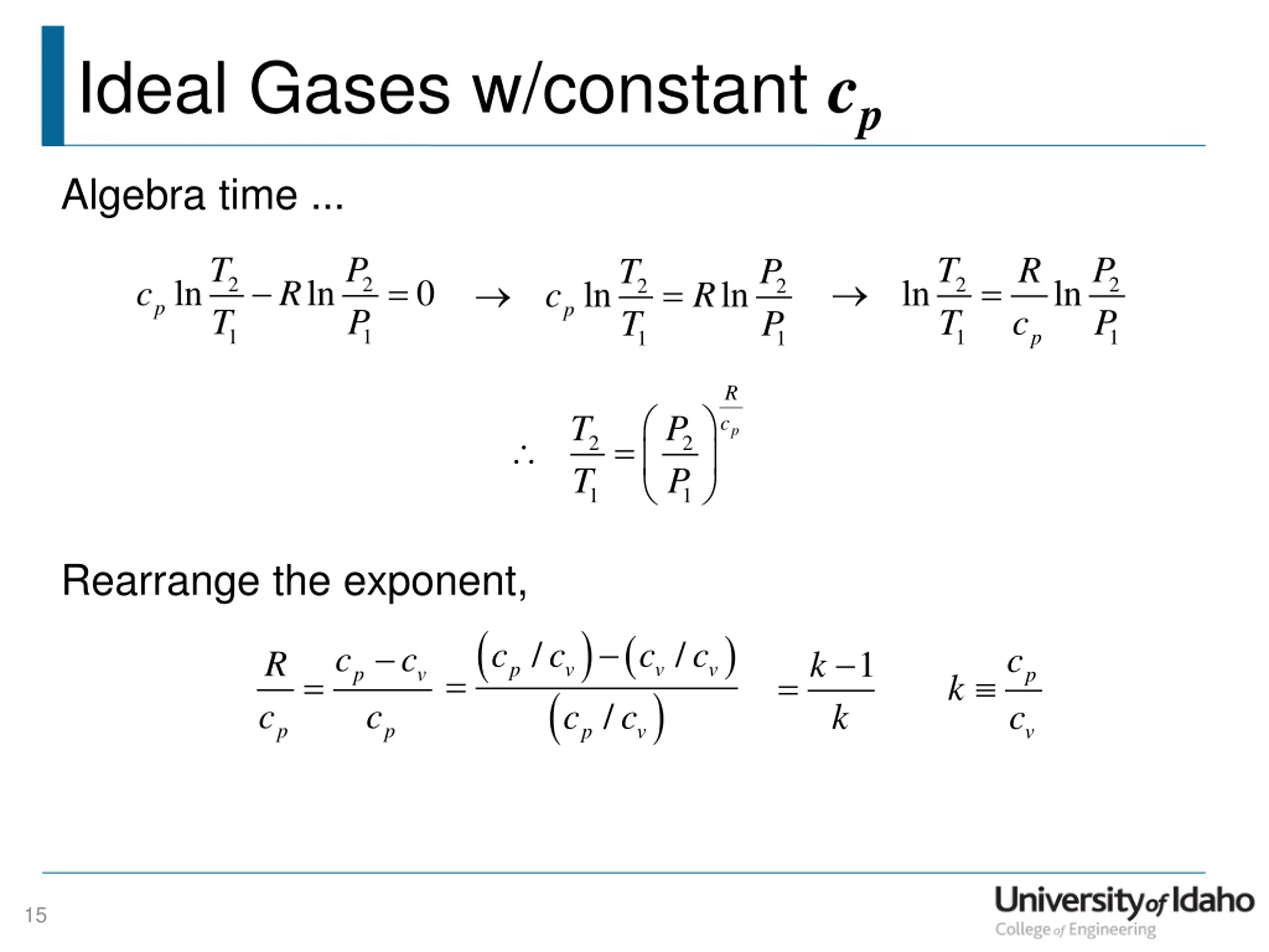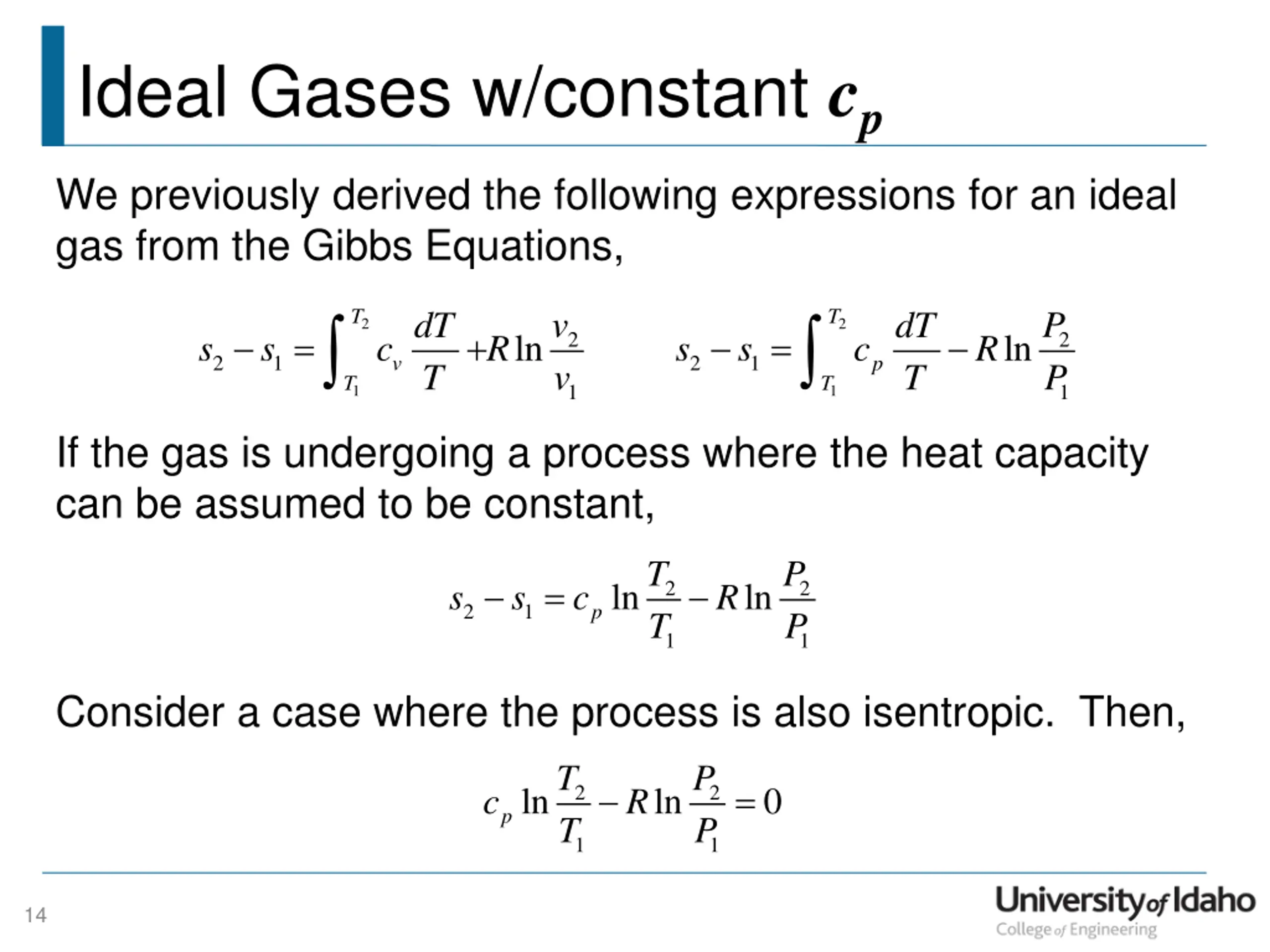 Ideal Gases w/constant cp We previously derived the following expressions for an ideal gas from the Gibbs Equations, v v P P dT T dT T T T 2 2 = + = ln ln s s c R s s c R 2 2 2 1 2 1 v p T T 1 1 1 1 If the gas is undergoing a process where the heat capacity can be assumed to be constant, T T P P = ln ln s s c R 2 2 2 1 p 1 1 Consider a case where the process is also isentropic. Then, T T P P = ln ln 0 c R 2 2 p 1 1 14