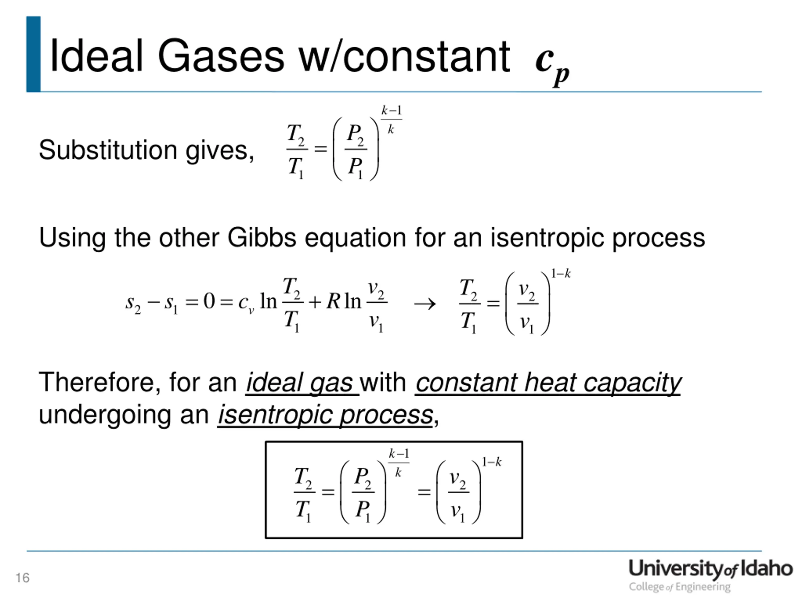 Ideal Gases w/constant cp Algebra time ... T T P P T T P P R c T T P P = = = ln ln 0 ln ln c R 2 2 2 2 ln ln c 2 R 2 p p 1 1 1 1 p 1 1 R c T T P P p = 2 2 1 1 Rearrange the exponent, ( ) ( / p ) / / c c c c c c c c R c 1 k p v c v v = p v p = = k ( ) c c k p p v v 15
