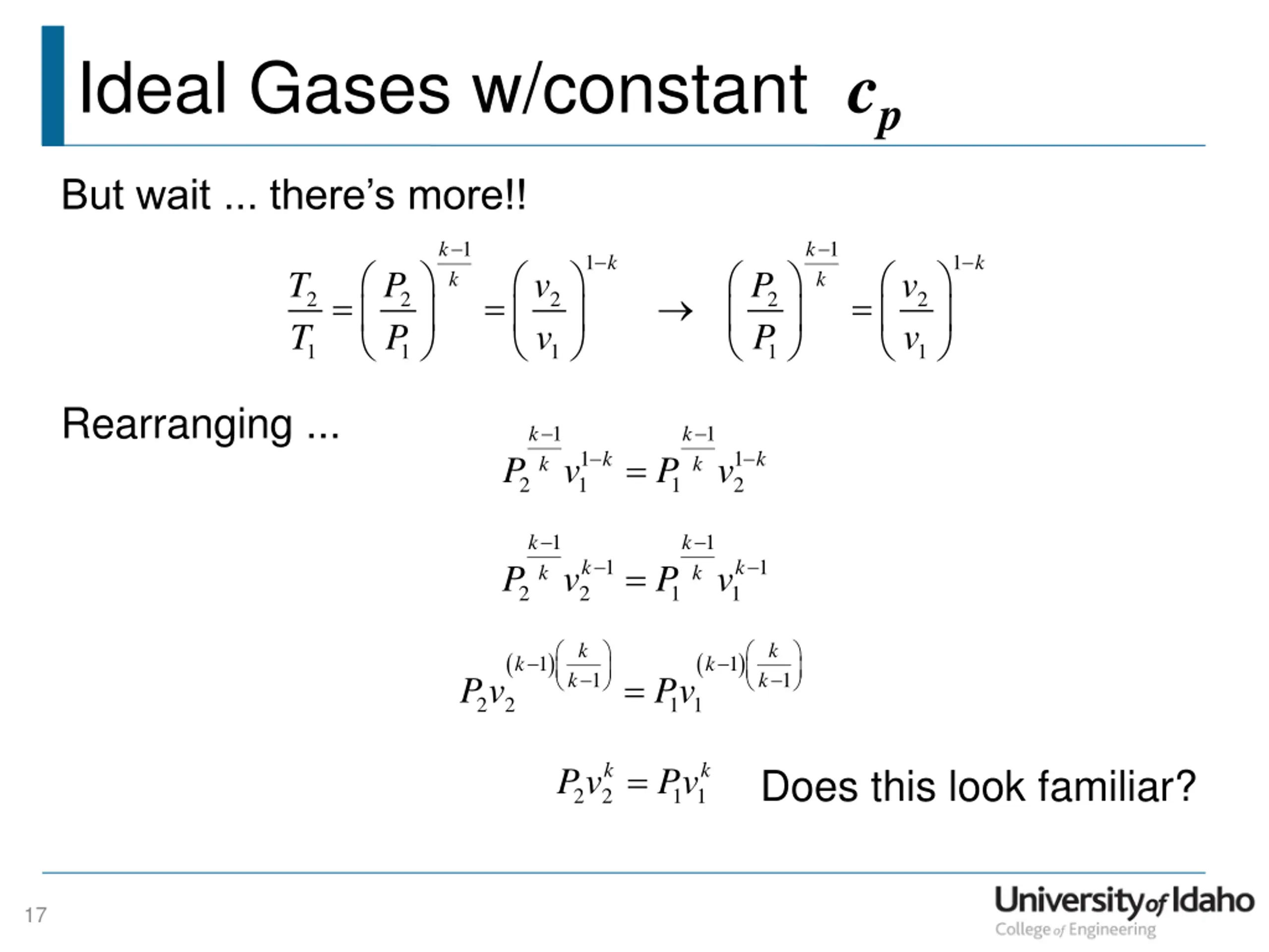 Ideal Gases w/constant cp 1 k T T P P k = Substitution gives, 2 2 1 1 Using the other Gibbs equation for an isentropic process 1 k T T v v T T v v = = + = 0 ln ln s s c R 2 2 2 2 2 1 v 1 1 1 1 Therefore, for an ideal gas with constant heat capacity undergoing an isentropic process, 1 k 1 k T T P P v v k = = 2 2 2 1 1 1 16