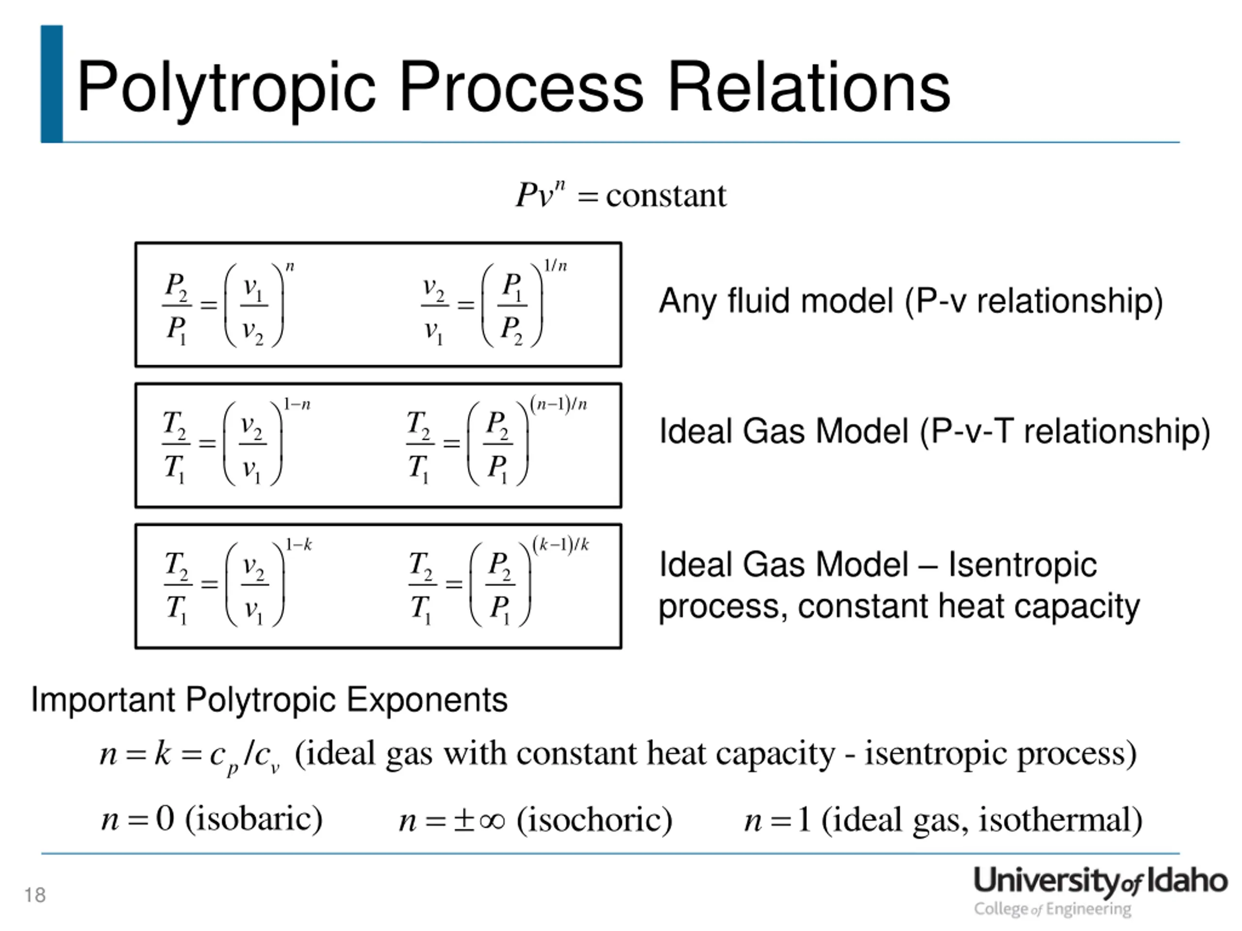 Polytropic Process Relations Pv = n constant 1/ n n P P v v v v P P Any fluid model (P-v relationship) = = 2 1 2 1 1 2 1 2 ( ) 1 / 1 n n n T T v v T T P P Ideal Gas Model (P-v-T relationship) = = 2 2 2 2 1 1 1 1 ( ) 1 / 1 k k k Ideal Gas Model Isentropic process, constant heat capacity T T v v T T P P = = 2 2 2 2 1 1 1 1 Important Polytropic Exponents = = / (ideal gas with constant heat capacity - isentropic process) v c c 0 (isobaric) n k p n = n = n = (isochoric) 1 (ideal gas, isothermal) 18