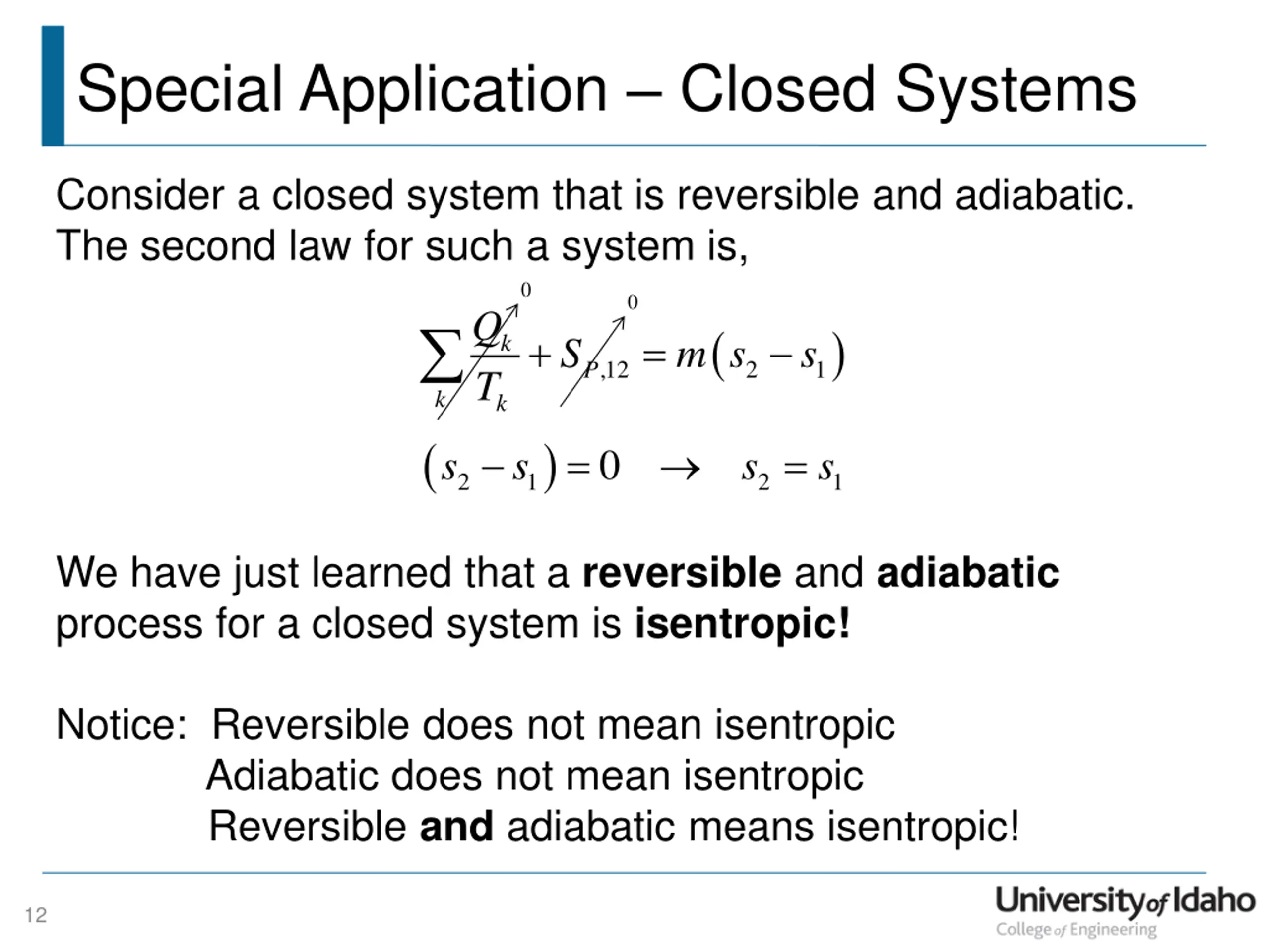 Special Application Closed Systems Consider a closed system that is reversible and adiabatic. The second law for such a system is, 0 0 Q T ( ) + = k S m s s ,12 2 1 P k k ( ) = = 0 s s s s 2 1 2 1 We have just learned that a reversible and adiabatic process for a closed system is isentropic! Notice: Reversible does not mean isentropic Adiabatic does not mean isentropic Reversible and adiabatic means isentropic! 12