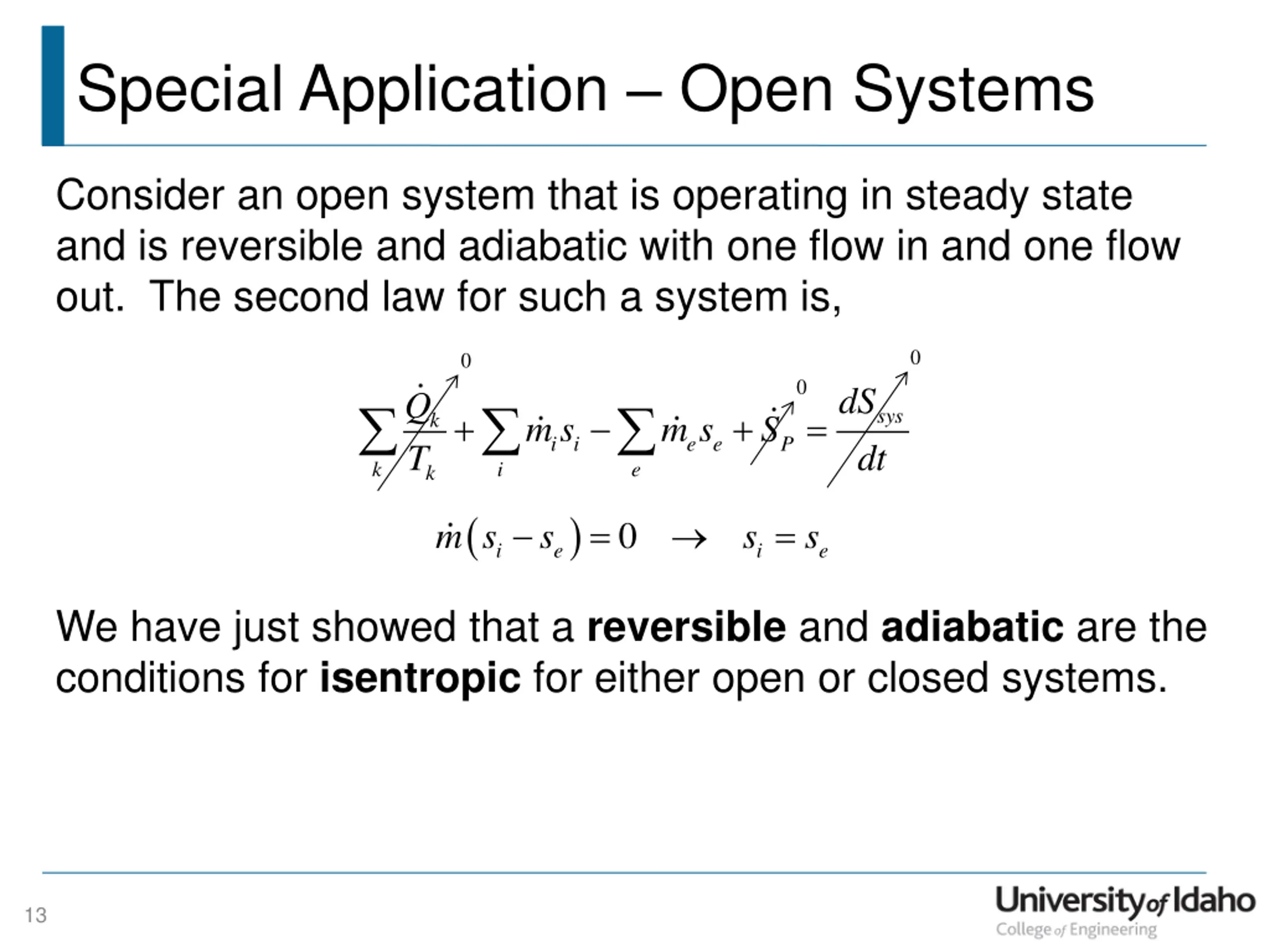 Special Application Open Systems Consider an open system that is operating in steady state and is reversible and adiabatic with one flow in and one flow out. The second law for such a system is, 0 0 0 dS Q T sys + + = k ms m s S i i e e P dt k i e k ( ) = = 0 m s s s s i e i e We have just showed that a reversible and adiabatic are the conditions for isentropic for either open or closed systems. 13