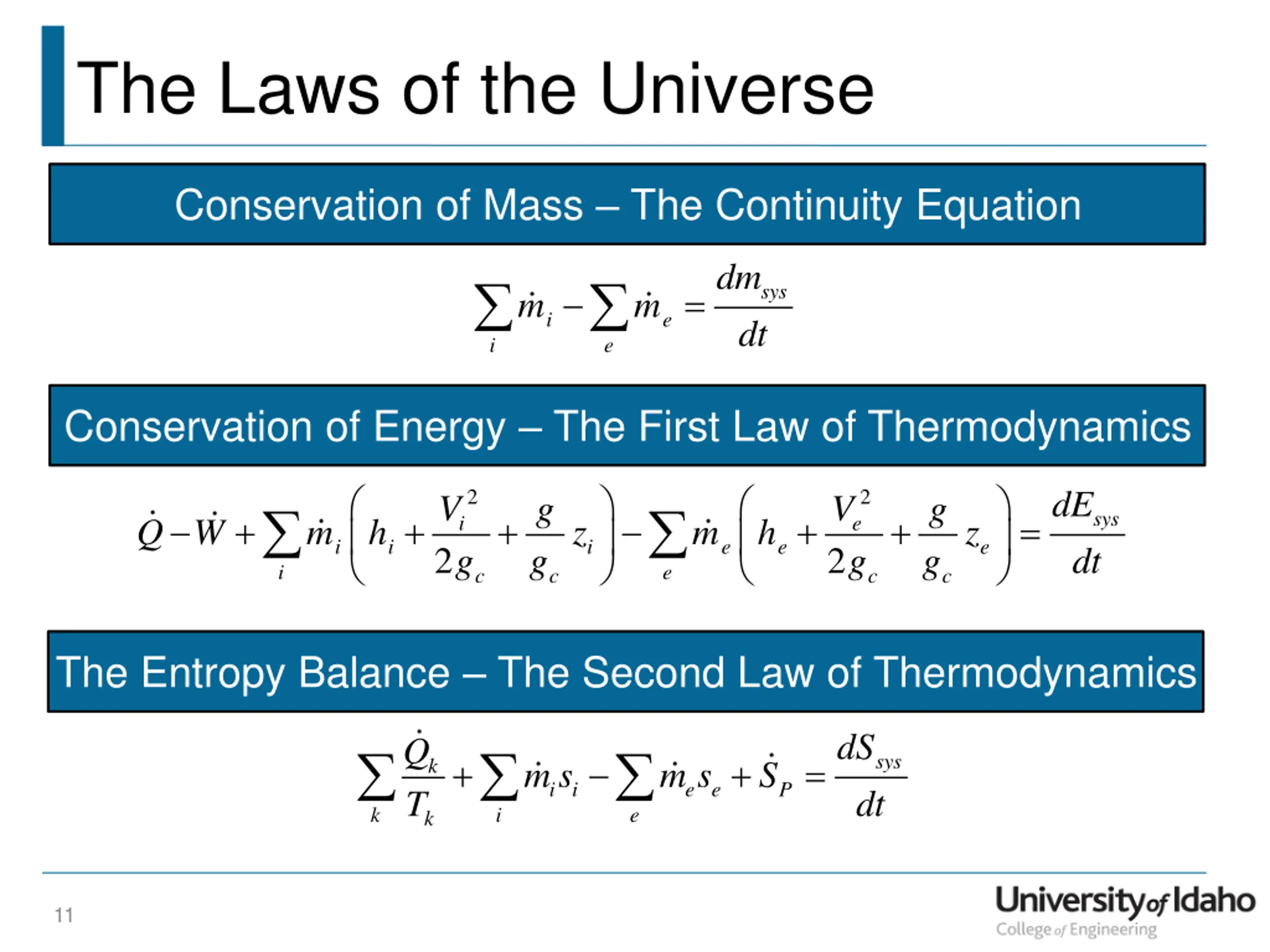 The Laws of the Universe Conservation of Mass The Continuity Equation dm dt sys = m m i e i e Conservation of Energy The First Law of Thermodynamics dE dt 2 2 V V g g g g sys Q W + + + + + = i e g m h z m h z i i i e e e 2 2 g i e c c c c The Entropy Balance The Second Law of Thermodynamics dS Q T sys + + = k ms m s S i i e e P dt k i e k 11