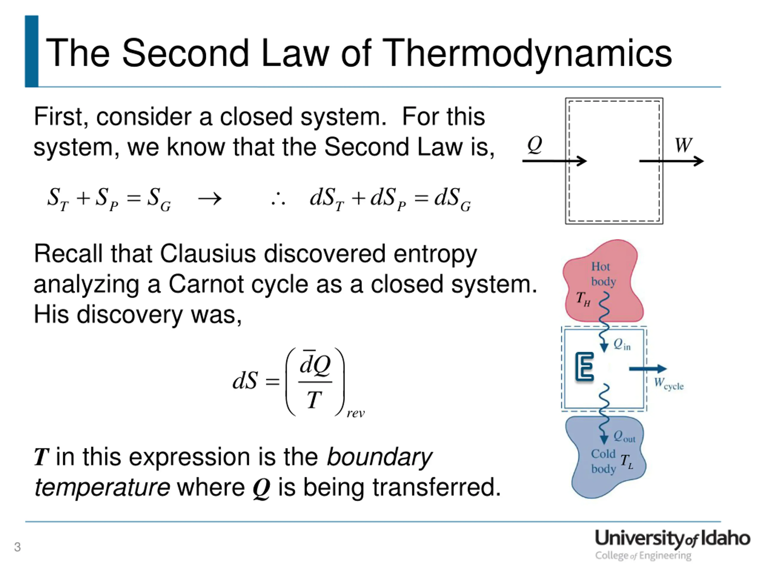 The Second Law of Thermodynamics First, consider a closed system. For this system, we know that the Second Law is, Q W + = + = S S S dS dS dS T P G T P G Recall that Clausius discovered entropy analyzing a Carnot cycle as a closed system. His discovery was, T H E dQ T = dS rev T in this expression is the boundary temperature where Q is being transferred. L T 3