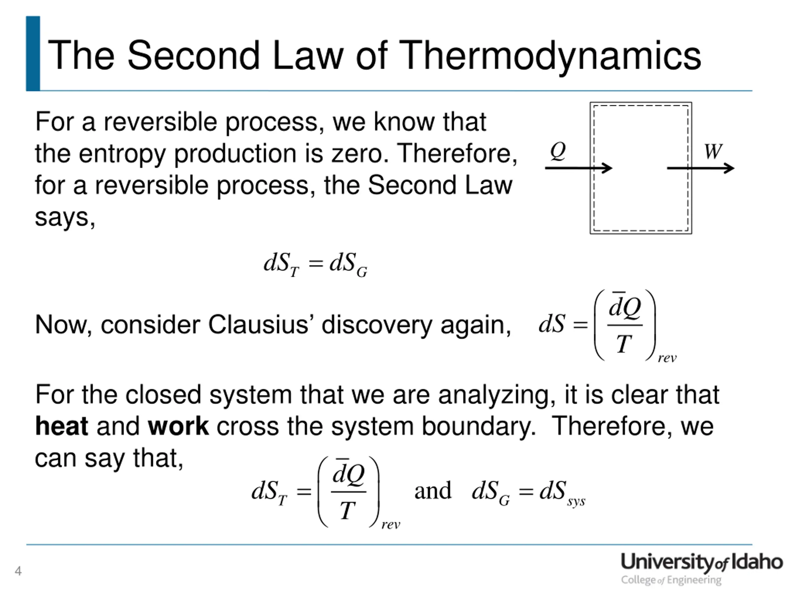 The Second Law of Thermodynamics For a reversible process, we know that the entropy production is zero. Therefore, for a reversible process, the Second Law says, Q W = dS dS T G dQ T = dS Now, consider Clausius discovery again, rev For the closed system that we are analyzing, it is clear that heat and work cross the system boundary. Therefore, we can say that, dQ dS T = = and dS dS T G sys rev 4
