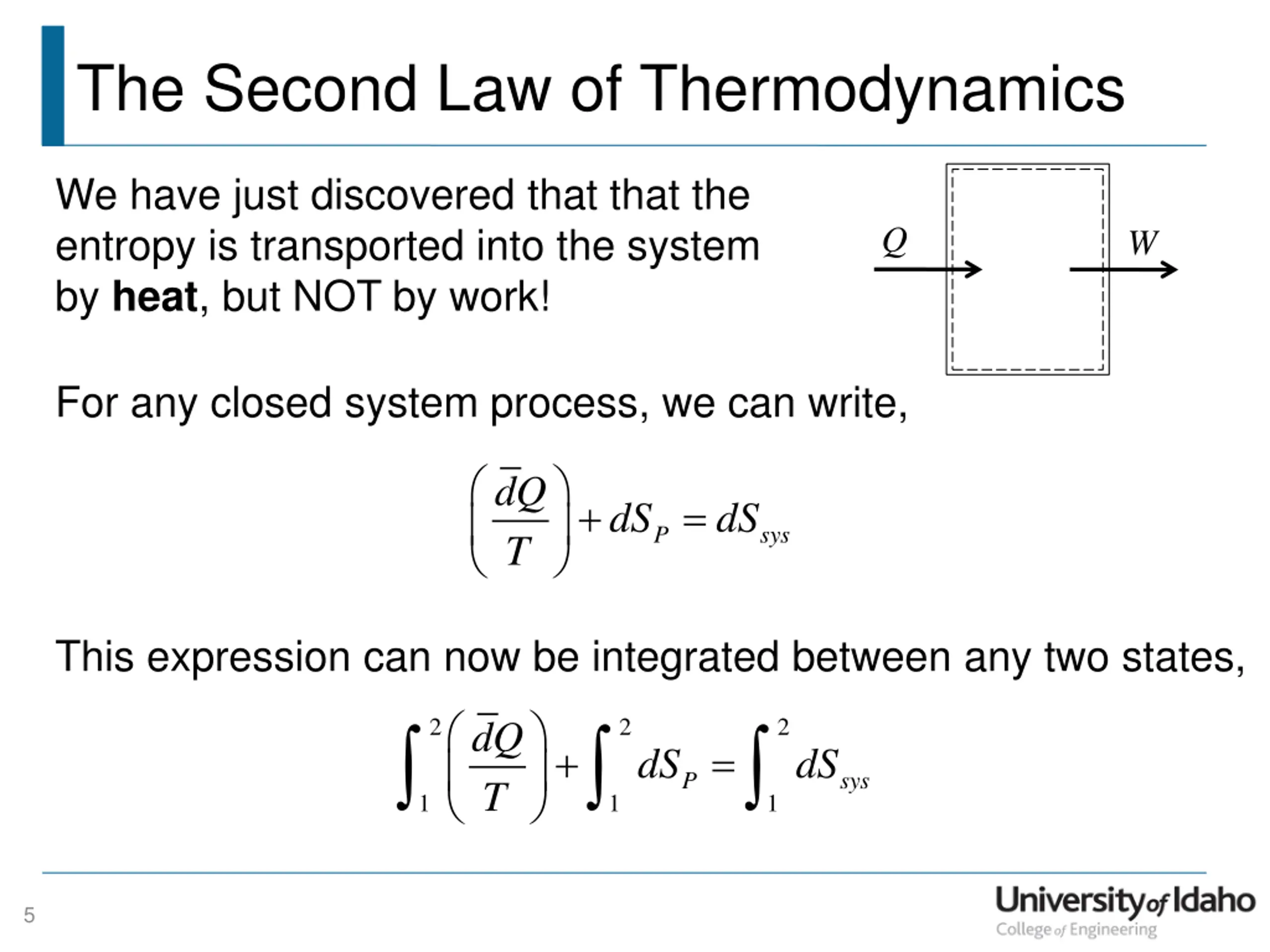 The Second Law of Thermodynamics We have just discovered that that the entropy is transported into the system by heat, but NOT by work! Q W For any closed system process, we can write, + dQ T = dS dS P sys This expression can now be integrated between any two states, + 2 2 2 dQ T = dS dS P sys 1 1 1 5