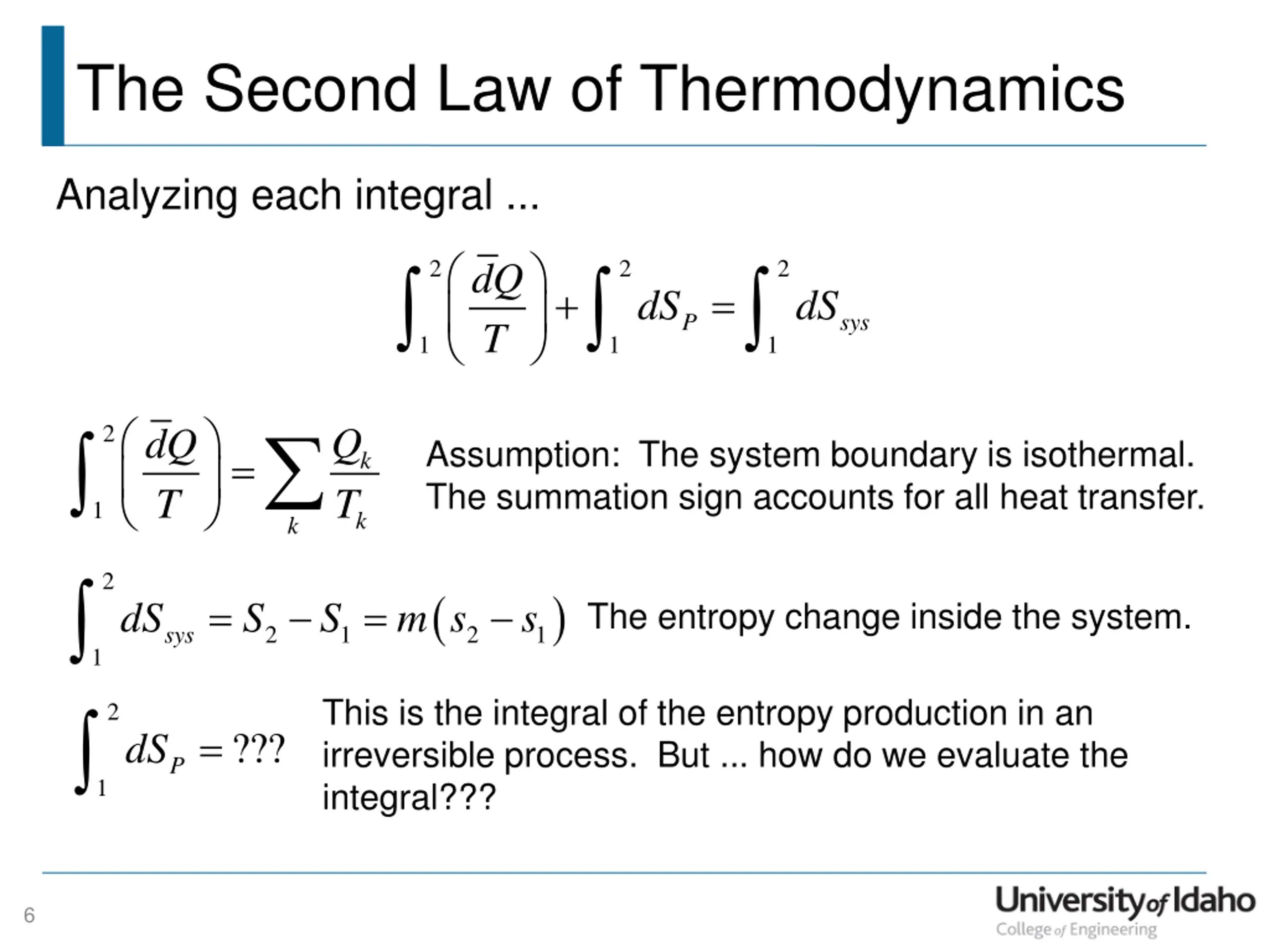 The Second Law of Thermodynamics Analyzing each integral ... + 2 2 2 dQ T = dS dS P sys 1 1 1 = Q T 2 dQ T Assumption: The system boundary is isothermal. The summation sign accounts for all heat transfer. k 1 k k 2 ( ) = = dS S S m s s The entropy change inside the system. 2 1 2 1 sys 1 This is the integral of the entropy production in an irreversible process. But ... how do we evaluate the integral??? 2 dS = ??? P 1 6