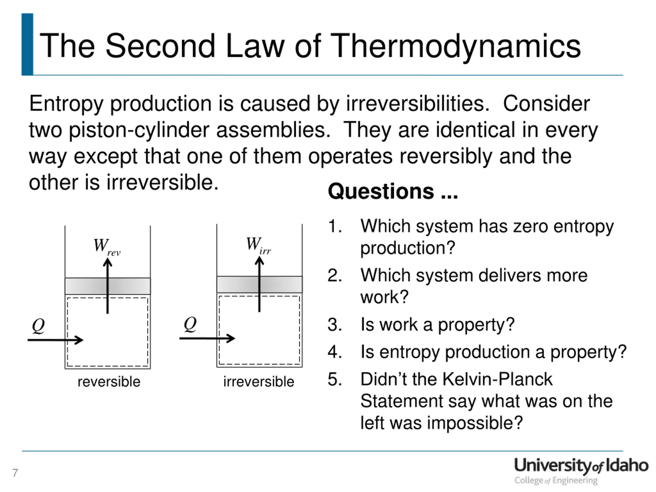 The Second Law of Thermodynamics Entropy production is caused by irreversibilities. Consider two piston-cylinder assemblies. They are identical in every way except that one of them operates reversibly and the other is irreversible. Questions ... 1. Which system has zero entropy production? Which system delivers more work? Is work a property? Is entropy production a property? Didn t the Kelvin-Planck Statement say what was on the left was impossible? W W irr rev 2. Q 3. 4. 5. Q reversible irreversible 7