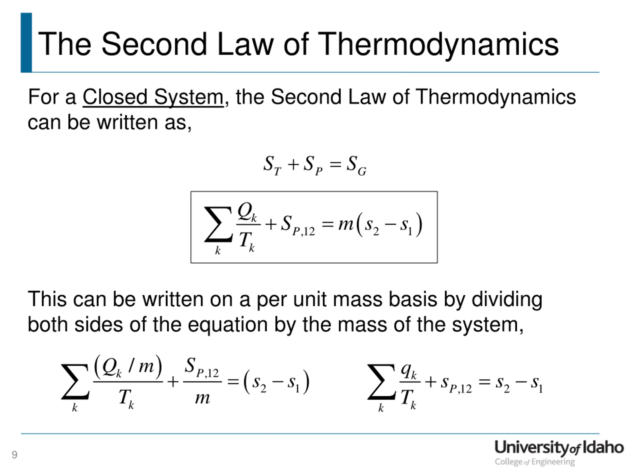 The Second Law of Thermodynamics For a Closed System, the Second Law of Thermodynamics can be written as, + = S S S T P G Q T ( ) + = k S m s s ,12 2 1 P k k This can be written on a per unit mass basis by dividing both sides of the equation by the mass of the system, ( ) ( 2 k k T m S / Q m q T ) + = ,12 + = P k s s k s s s 1 ,12 2 1 P k k 9