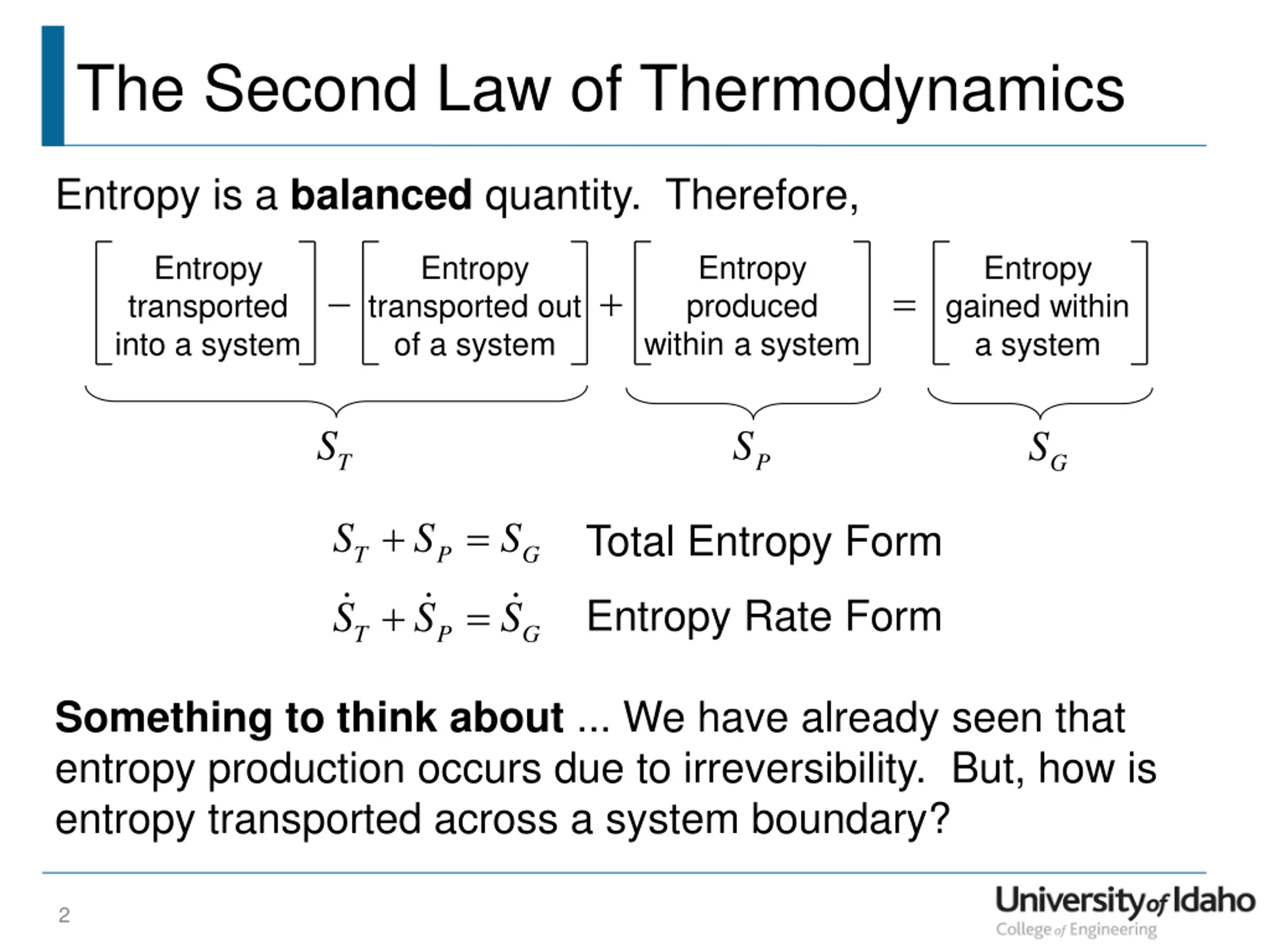 The Second Law of Thermodynamics Entropy is a balanced quantity. Therefore, Entropy produced within a system Entropy transported into a system Entropy transported out of a system Entropy gained within a system + = T S S S P G + = S S S Total Entropy Form T P G + = Entropy Rate Form S S S T P G Something to think about ... We have already seen that entropy production occurs due to irreversibility. But, how is entropy transported across a system boundary? 2