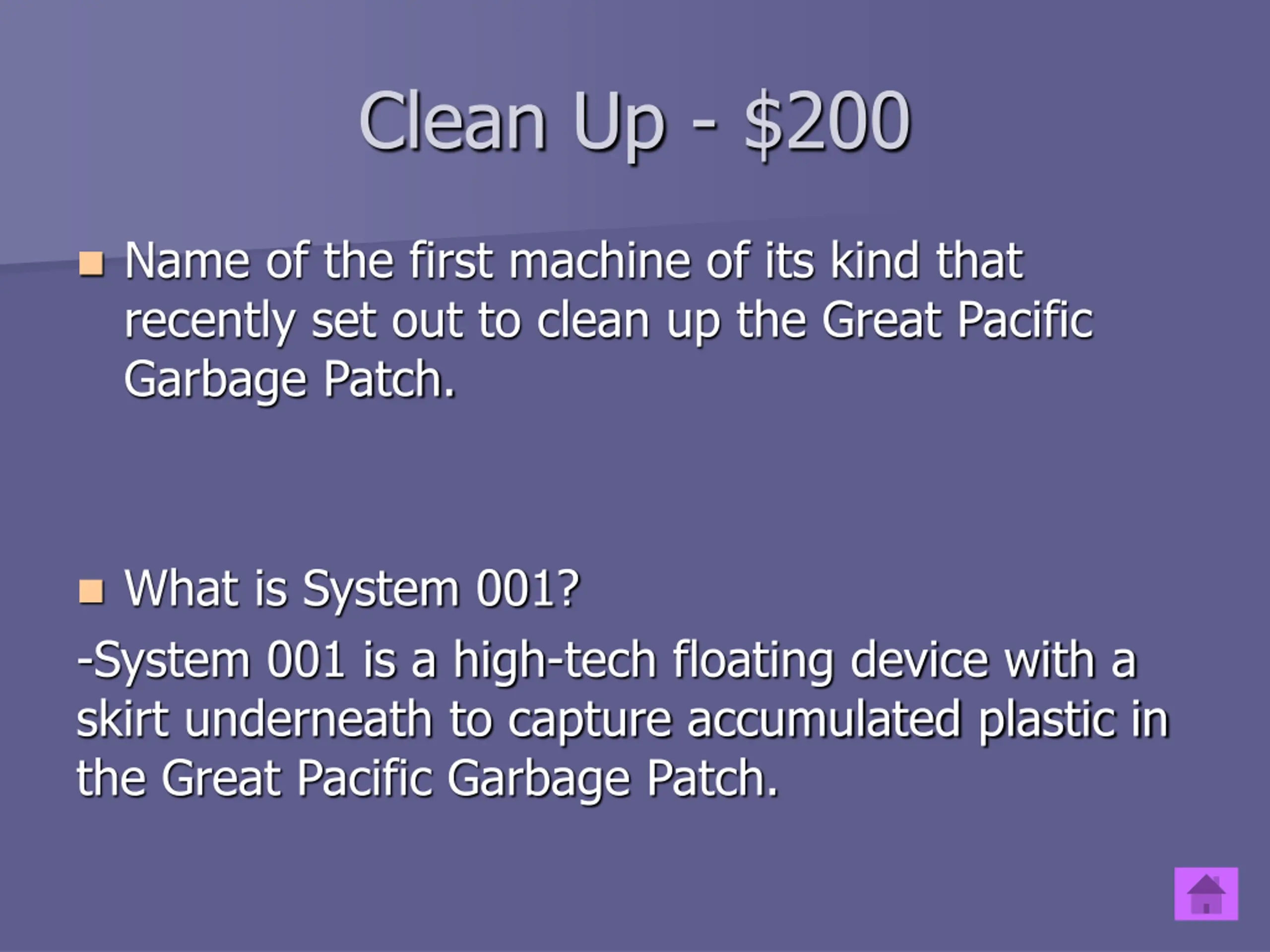 Clean Up - $200 Name of the first machine of its kind that recently set out to clean up the Great Pacific Garbage Patch. What is System 001? -System 001 is a high-tech floating device with a skirt underneath to capture accumulated plastic in the Great Pacific Garbage Patch.