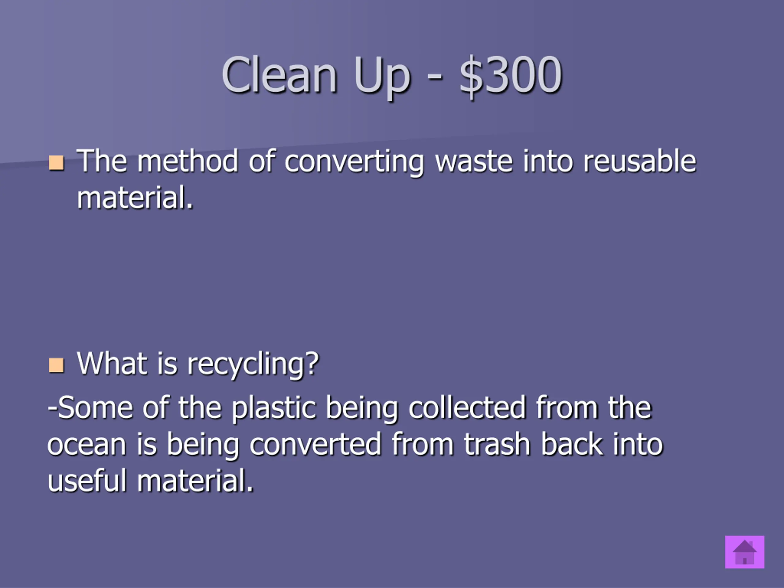 Clean Up - $300 The method of converting waste into reusable material. What is recycling? -Some of the plastic being collected from the ocean is being converted from trash back into useful material.