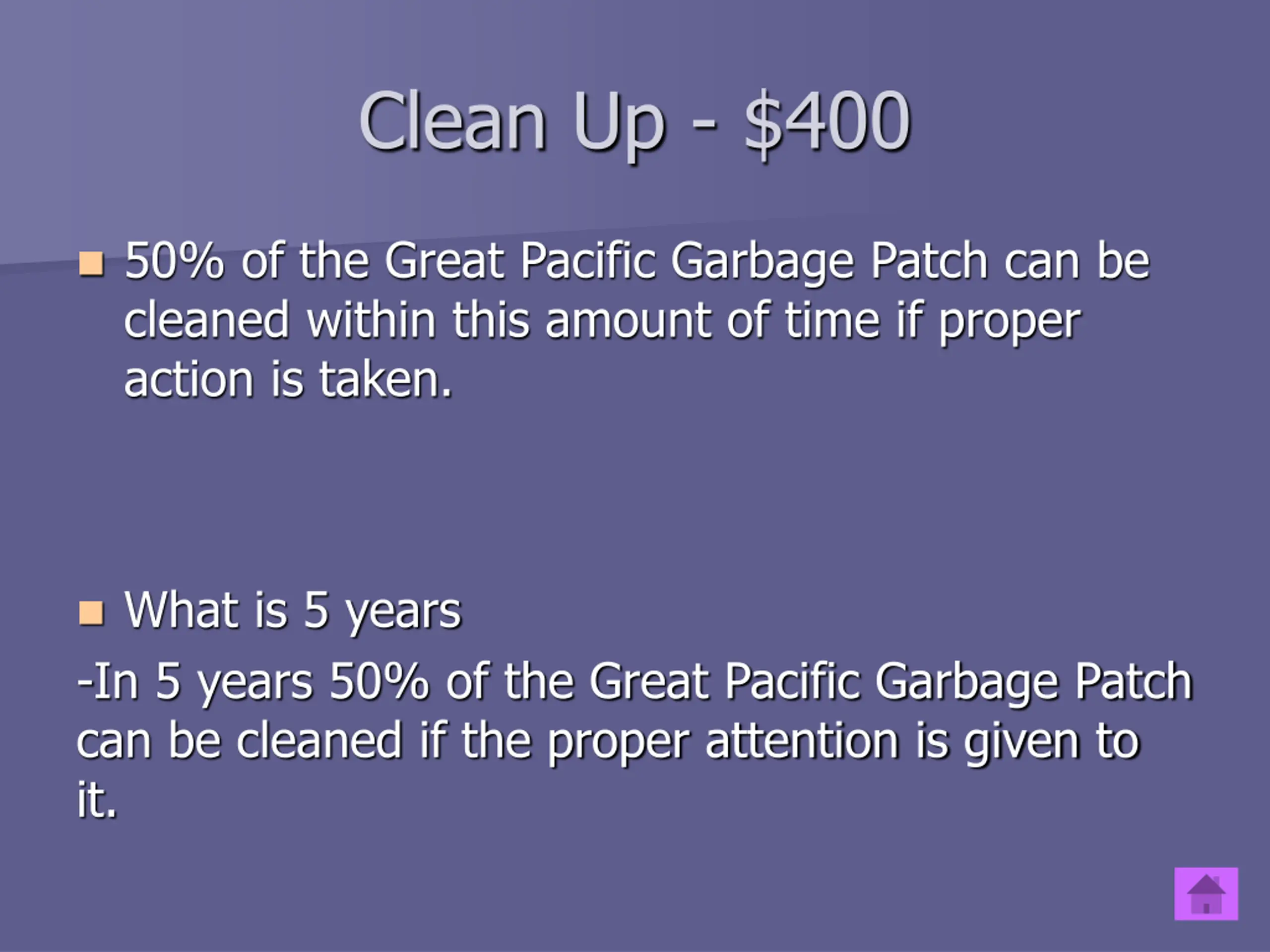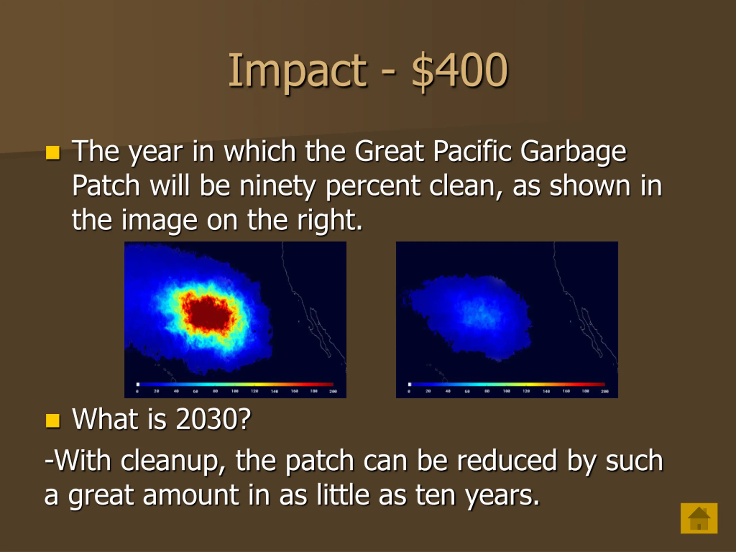 Impact - $400 The year in which the Great Pacific Garbage Patch will be ninety percent clean, as shown in the image on the right. What is 2030? -With cleanup, the patch can be reduced by such a great amount in as little as ten years.