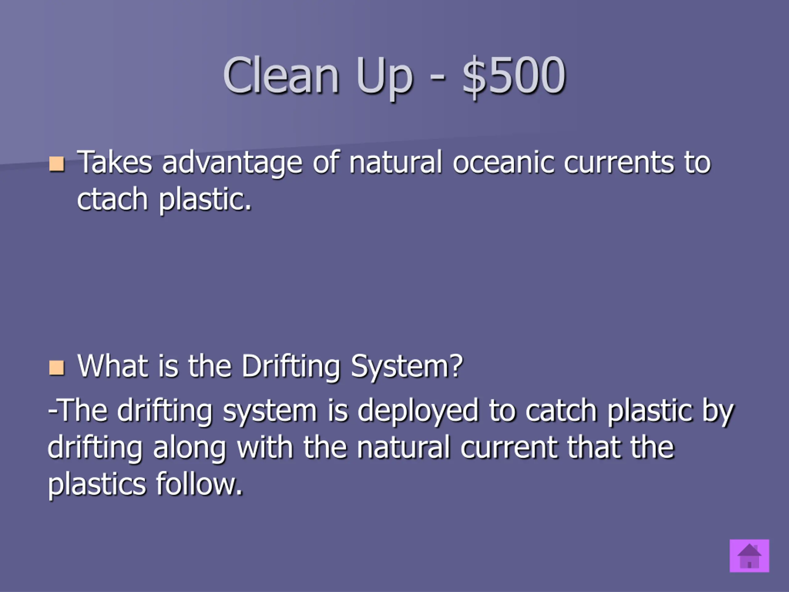 Clean Up - $500 Takes advantage of natural oceanic currents to ctach plastic. What is the Drifting System? -The drifting system is deployed to catch plastic by drifting along with the natural current that the plastics follow.
