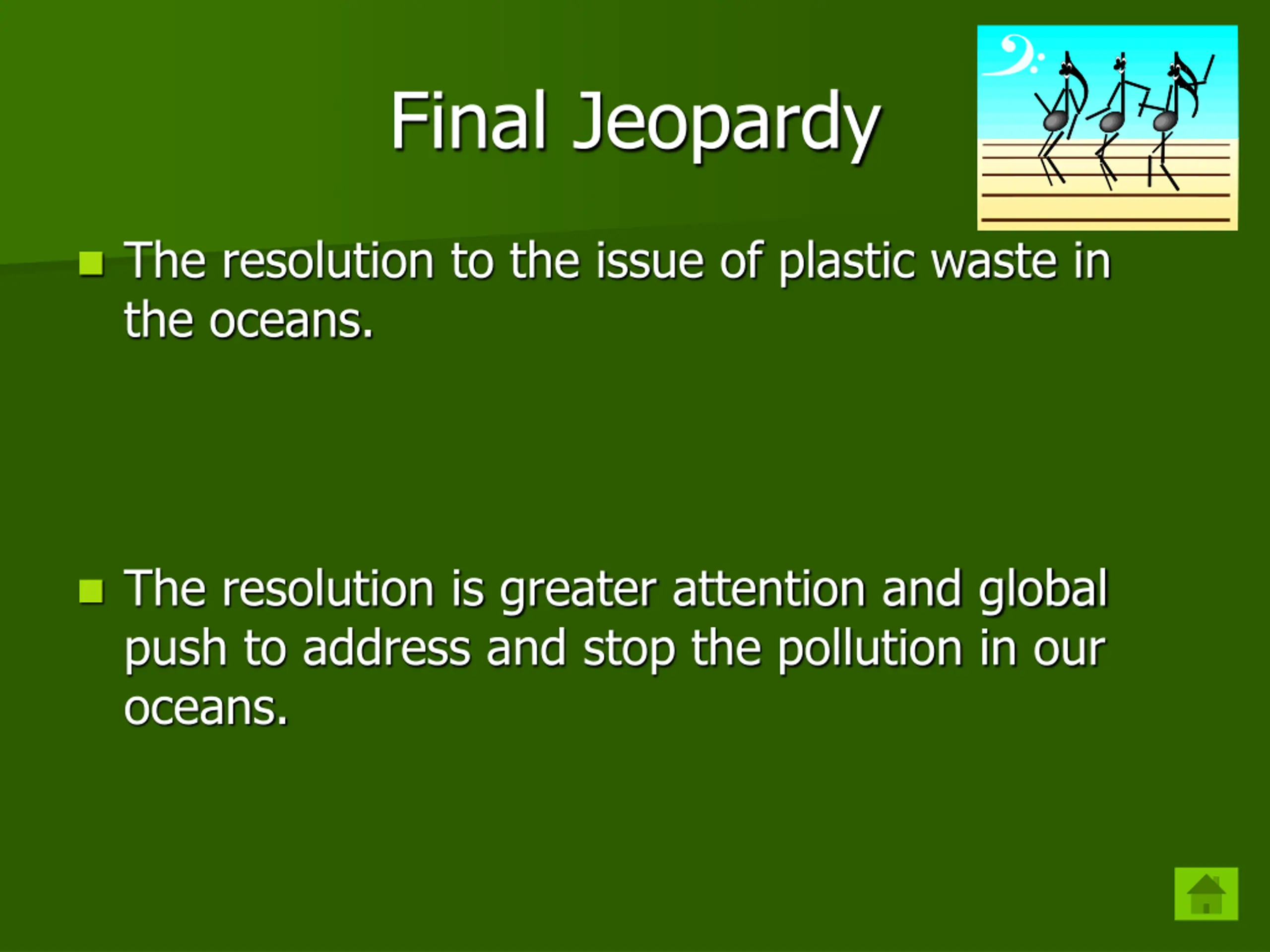 Final Jeopardy The resolution to the issue of plastic waste in the oceans. The resolution is greater attention and global push to address and stop the pollution in our oceans.