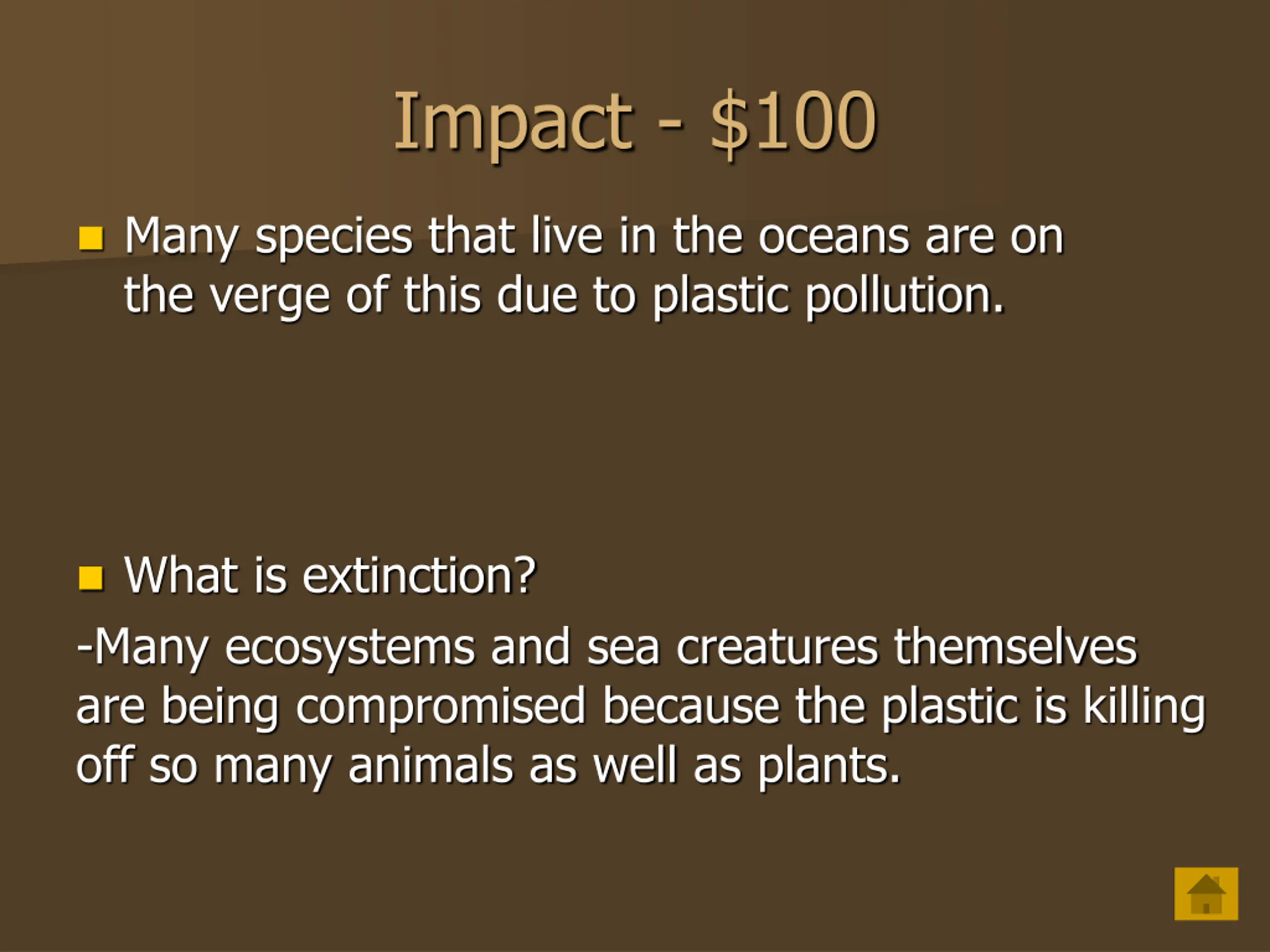 Impact - $100 Many species that live in the oceans are on the verge of this due to plastic pollution. What is extinction? -Many ecosystems and sea creatures themselves are being compromised because the plastic is killing off so many animals as well as plants.