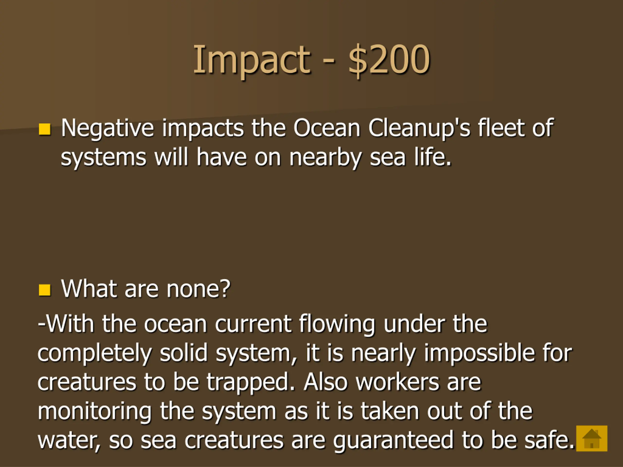 Impact - $200 Negative impacts the Ocean Cleanup's fleet of systems will have on nearby sea life. What are none? -With the ocean current flowing under the completely solid system, it is nearly impossible for creatures to be trapped. Also workers are monitoring the system as it is taken out of the water, so sea creatures are guaranteed to be safe.