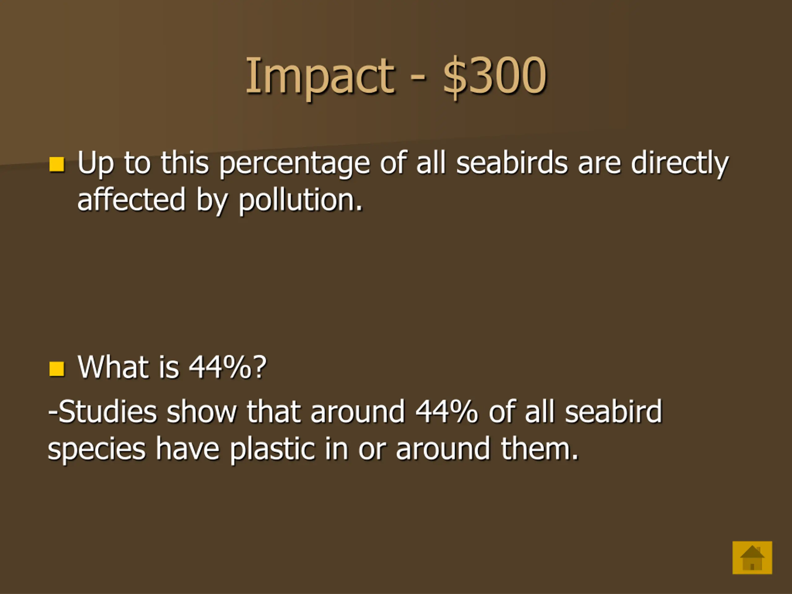 Impact - $300 Up to this percentage of all seabirds are directly affected by pollution. What is 44%? -Studies show that around 44% of all seabird species have plastic in or around them.