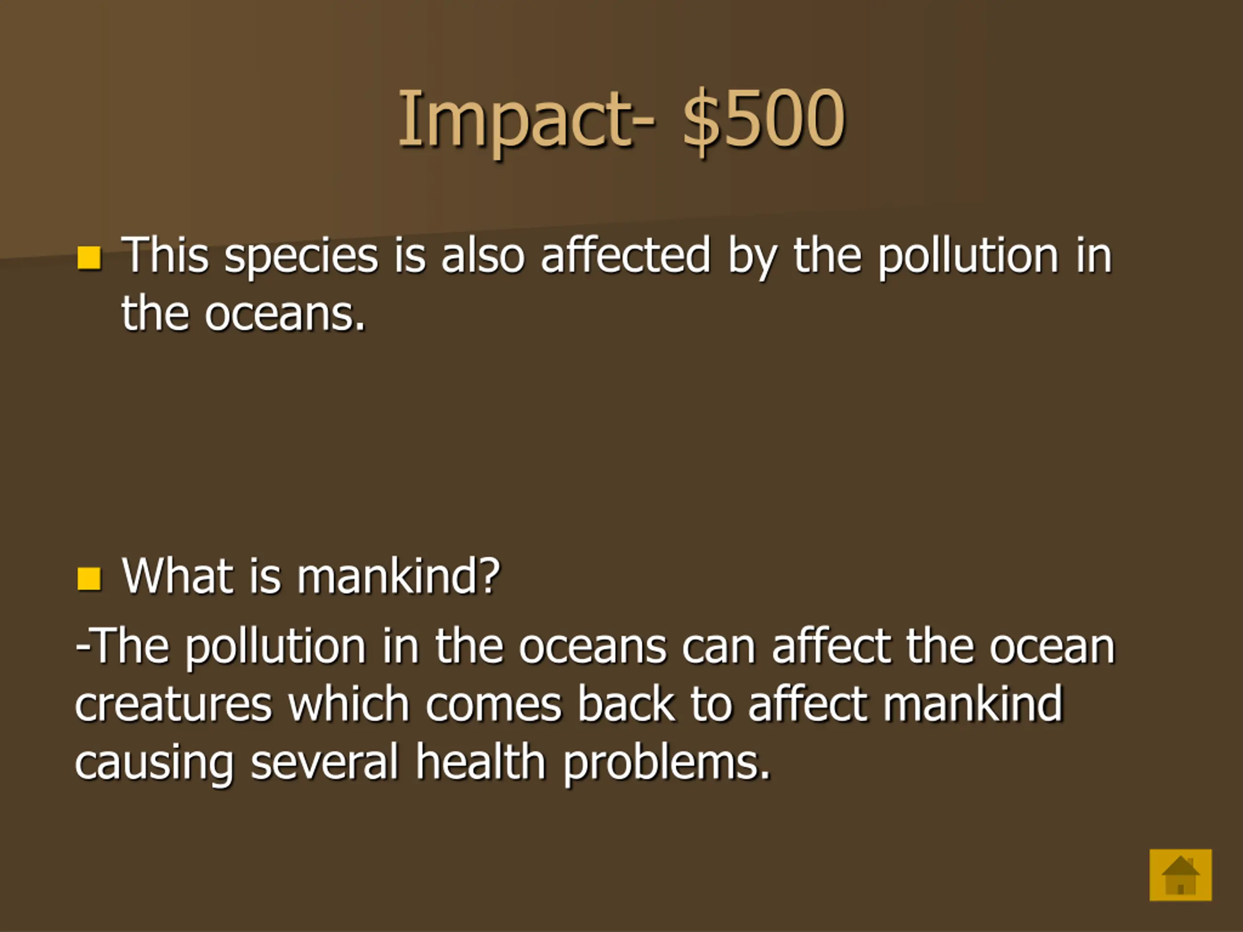 Impact- $500 This species is also affected by the pollution in the oceans. What is mankind? -The pollution in the oceans can affect the ocean creatures which comes back to affect mankind causing several health problems.