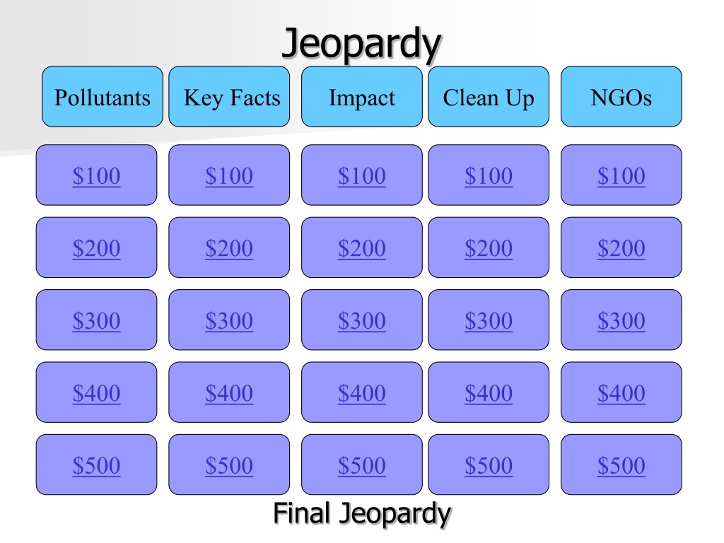 Jeopardy Key Facts NGOs Pollutants Impact Clean Up $100 $100 $100 $100 $100 $100 $100 $100 $100 $100 $200 $200 $200 $200 $200 $200 $200 $200 $200 $200 $300 $300 $300 $300 $300 $300 $300 $300 $300 $300 $400 $400 $400 $400 $400 $400 $400 $400 $400 $400 $500 $500 $500 $500 $500 $500 $500 $500 $500 $500 Final Jeopardy Final Jeopardy
