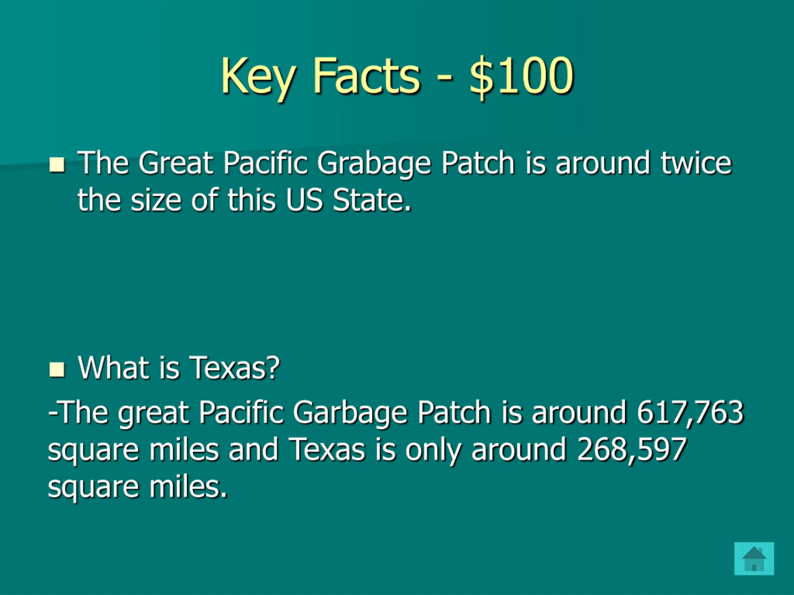 Key Facts - $100 The Great Pacific Grabage Patch is around twice the size of this US State. What is Texas? -The great Pacific Garbage Patch is around 617,763 square miles and Texas is only around 268,597 square miles.