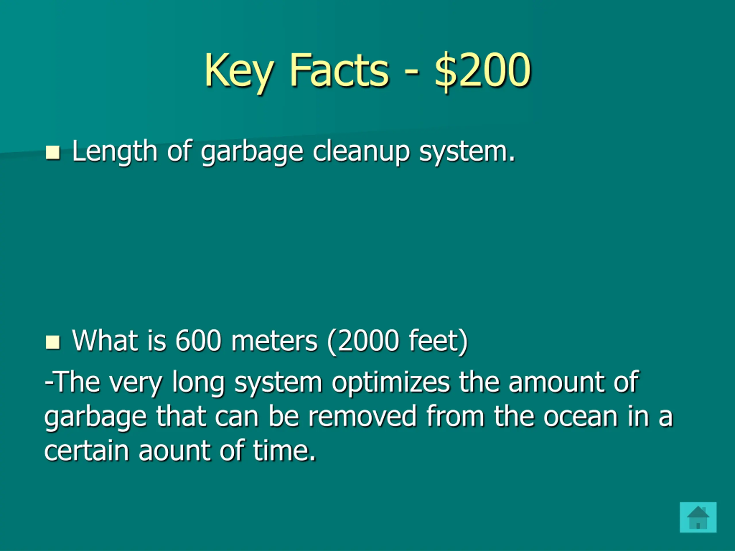Key Facts - $200 Length of garbage cleanup system. What is 600 meters (2000 feet) -The very long system optimizes the amount of garbage that can be removed from the ocean in a certain aount of time.