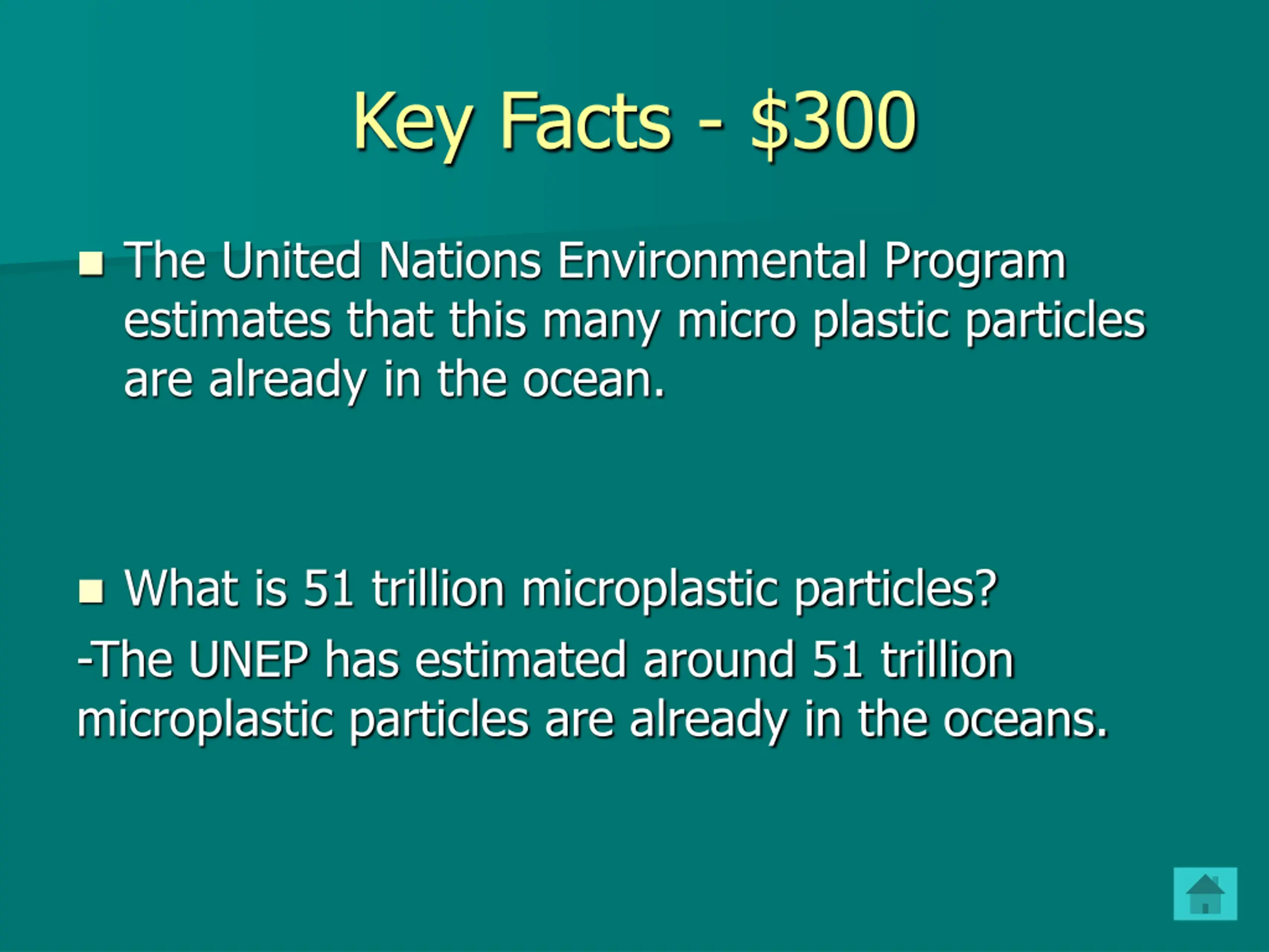 Key Facts - $300 The United Nations Environmental Program estimates that this many micro plastic particles are already in the ocean. What is 51 trillion microplastic particles? -The UNEP has estimated around 51 trillion microplastic particles are already in the oceans.