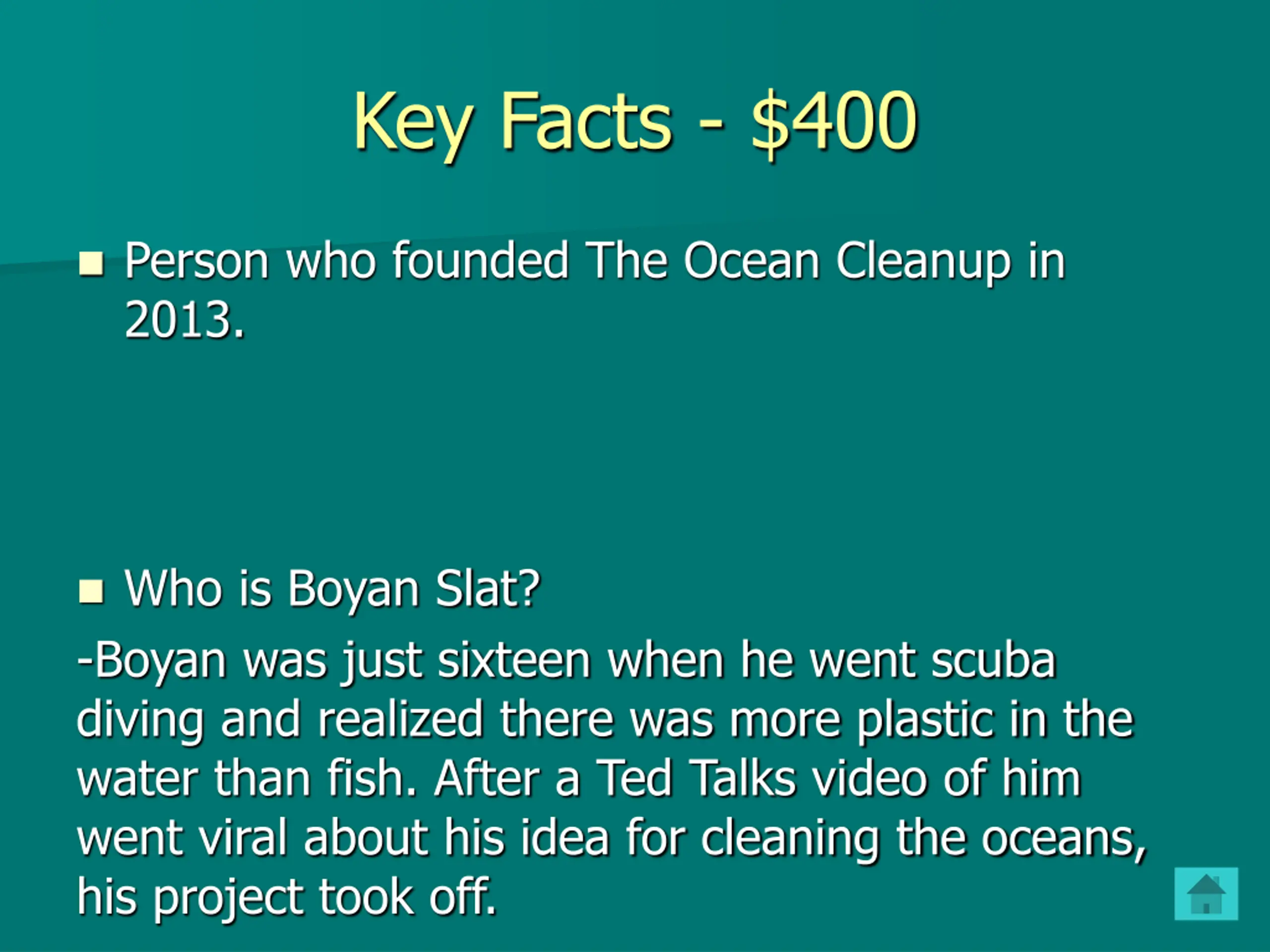 Key Facts - $400 Person who founded The Ocean Cleanup in 2013. Who is Boyan Slat? -Boyan was just sixteen when he went scuba diving and realized there was more plastic in the water than fish. After a Ted Talks video of him went viral about his idea for cleaning the oceans, his project took off.