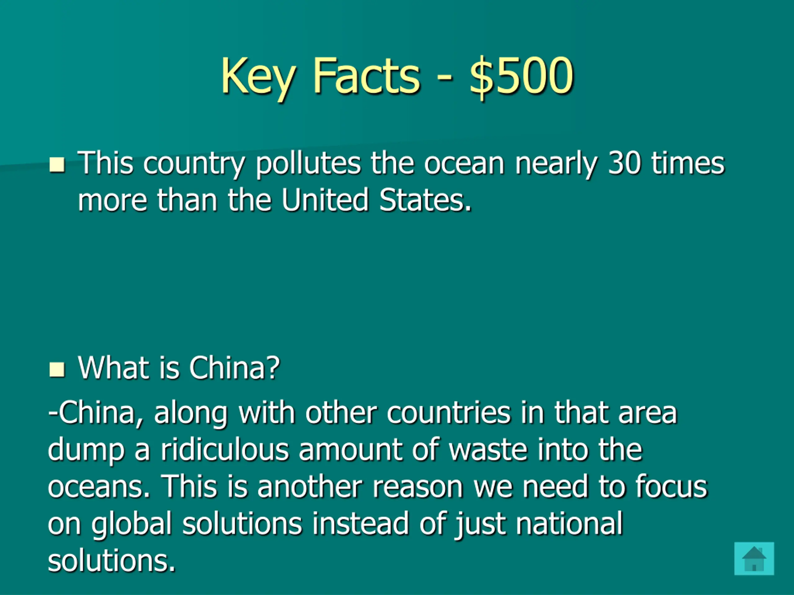 Key Facts - $500 This country pollutes the ocean nearly 30 times more than the United States. What is China? -China, along with other countries in that area dump a ridiculous amount of waste into the oceans. This is another reason we need to focus on global solutions instead of just national solutions.