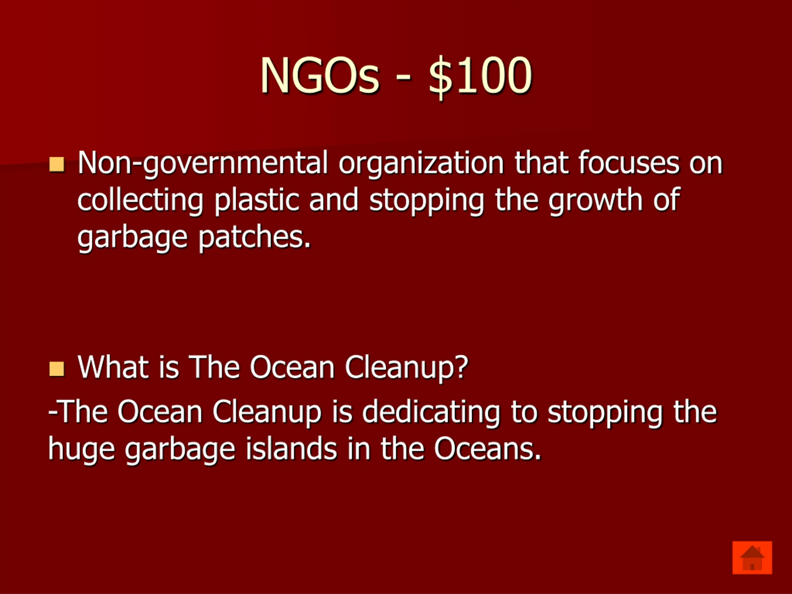 NGOs - $100 Non-governmental organization that focuses on collecting plastic and stopping the growth of garbage patches. What is The Ocean Cleanup? -The Ocean Cleanup is dedicating to stopping the huge garbage islands in the Oceans.