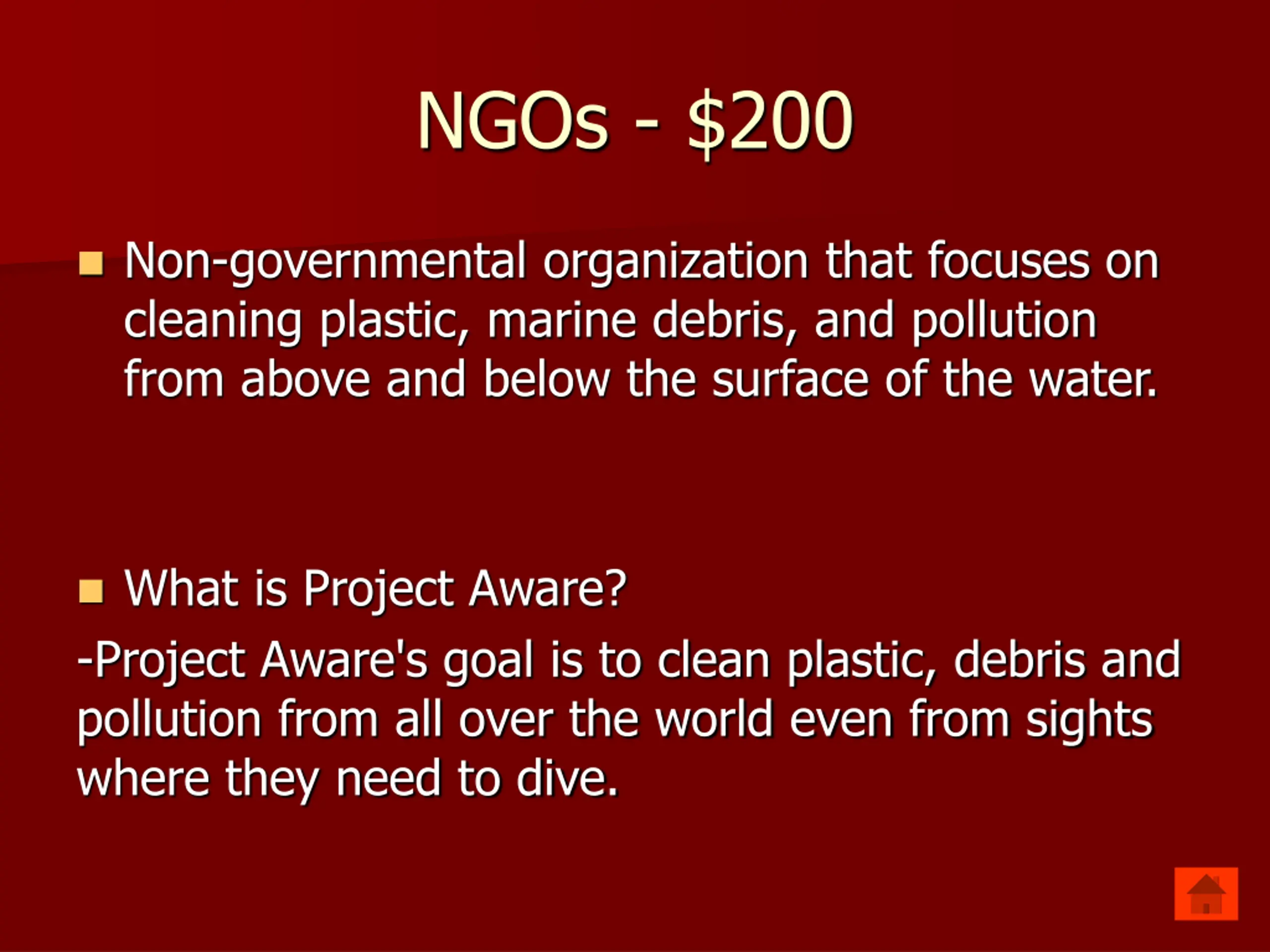 NGOs - $200 Non-governmental organization that focuses on cleaning plastic, marine debris, and pollution from above and below the surface of the water. What is Project Aware? -Project Aware's goal is to clean plastic, debris and pollution from all over the world even from sights where they need to dive.