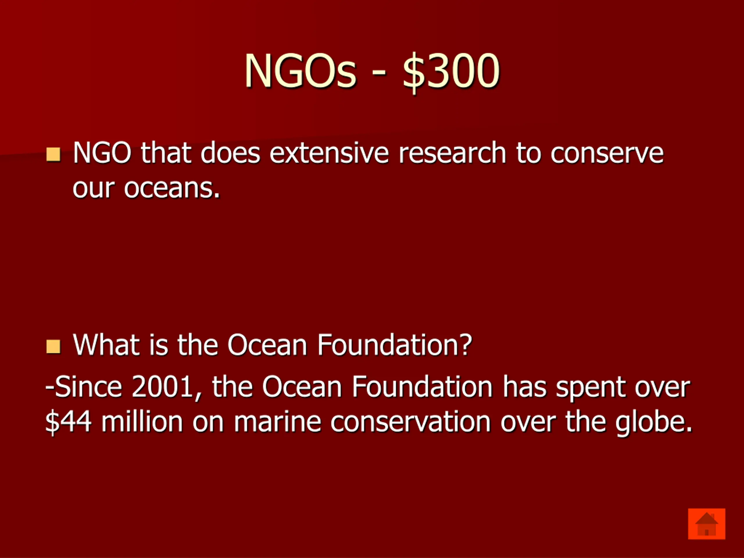 NGOs - $300 NGO that does extensive research to conserve our oceans. What is the Ocean Foundation? -Since 2001, the Ocean Foundation has spent over $44 million on marine conservation over the globe.