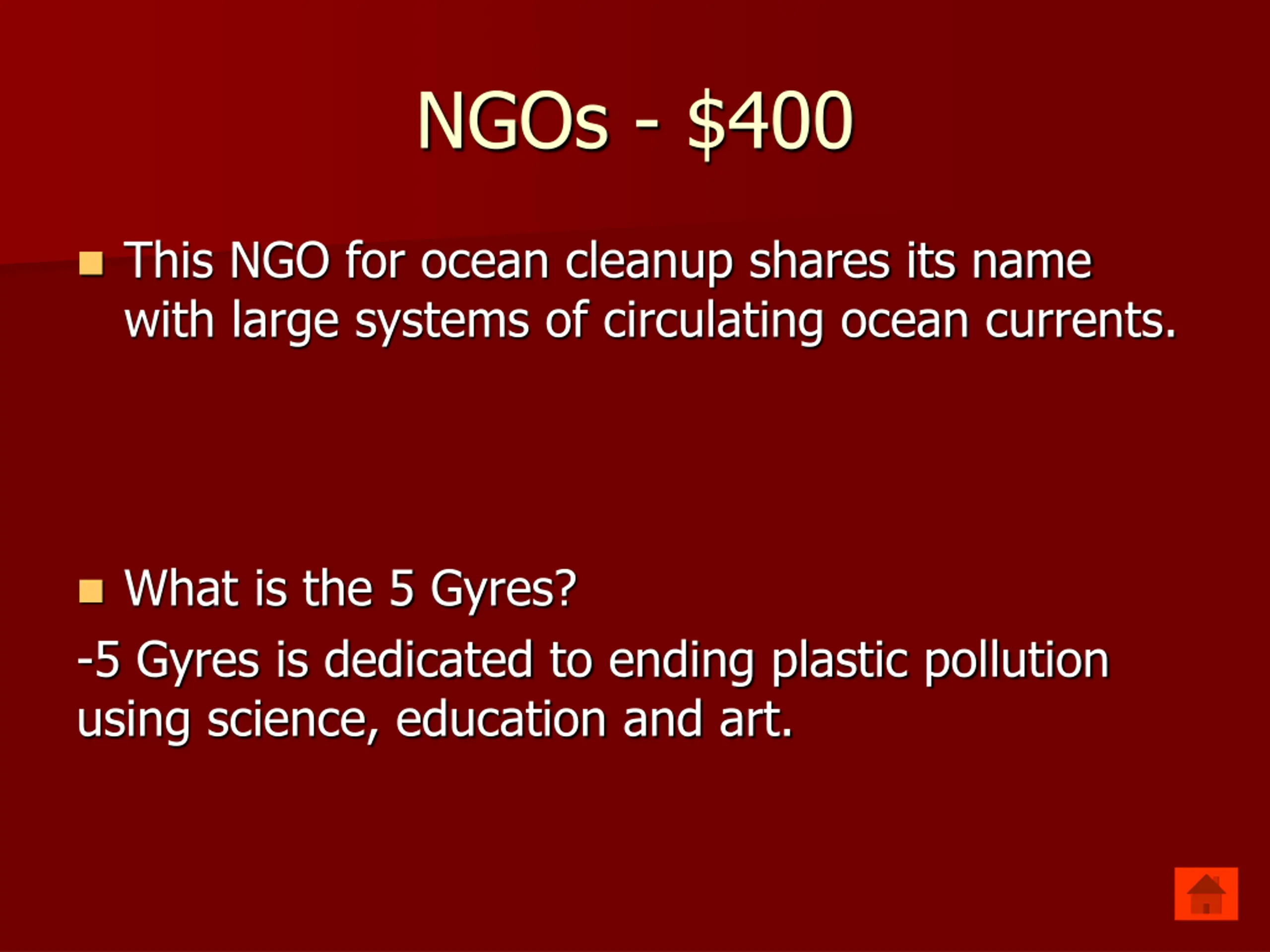 NGOs - $400 This NGO for ocean cleanup shares its name with large systems of circulating ocean currents. What is the 5 Gyres? -5 Gyres is dedicated to ending plastic pollution using science, education and art.