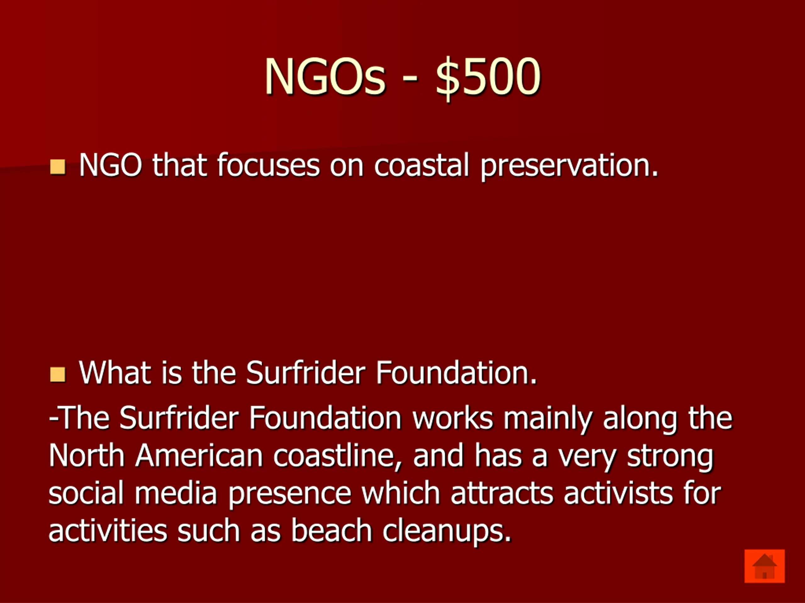 NGOs - $500 NGO that focuses on coastal preservation. What is the Surfrider Foundation. -The Surfrider Foundation works mainly along the North American coastline, and has a very strong social media presence which attracts activists for activities such as beach cleanups.