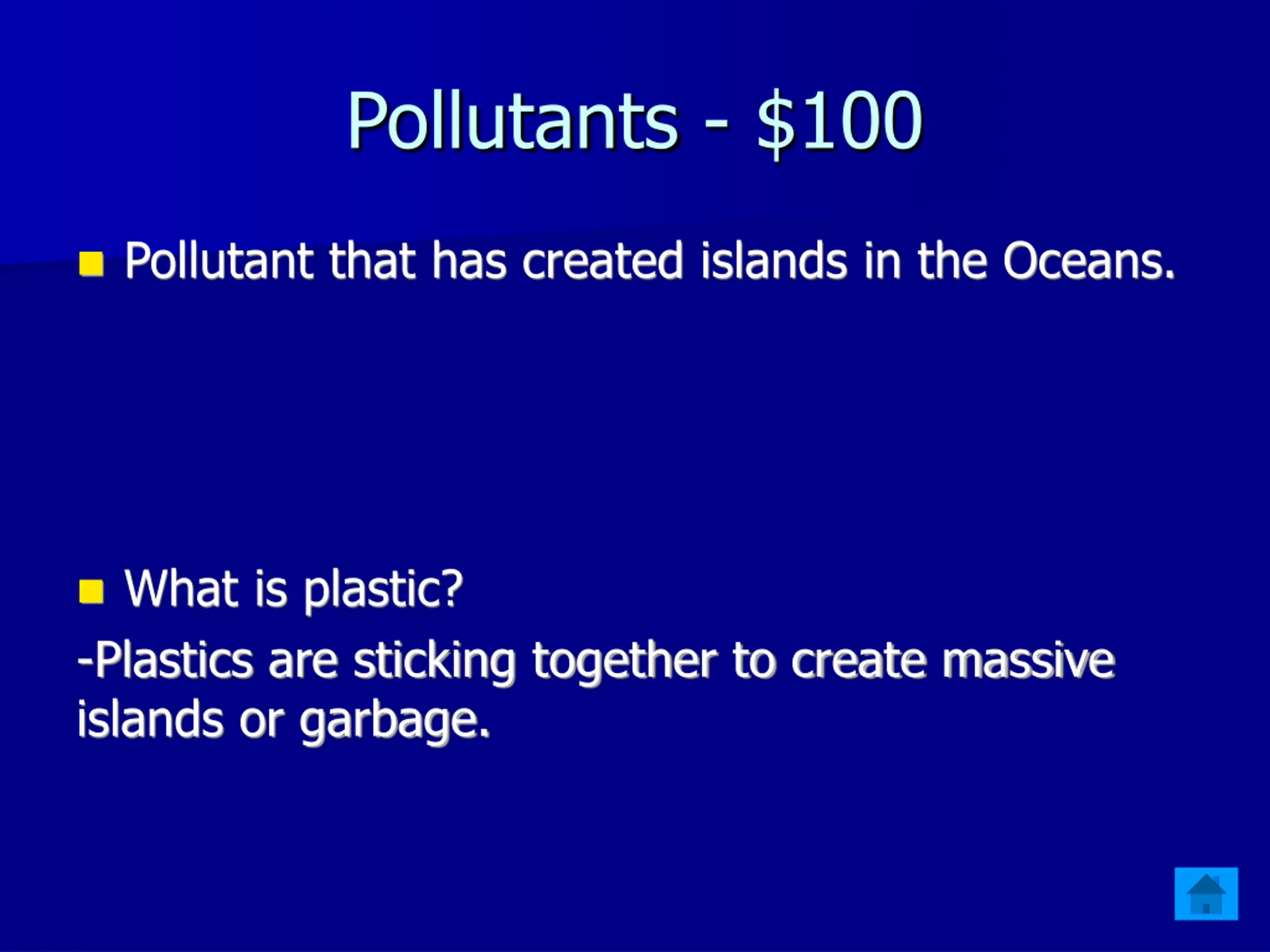 Pollutants - $100 Pollutant that has created islands in the Oceans. What is plastic? -Plastics are sticking together to create massive islands or garbage.