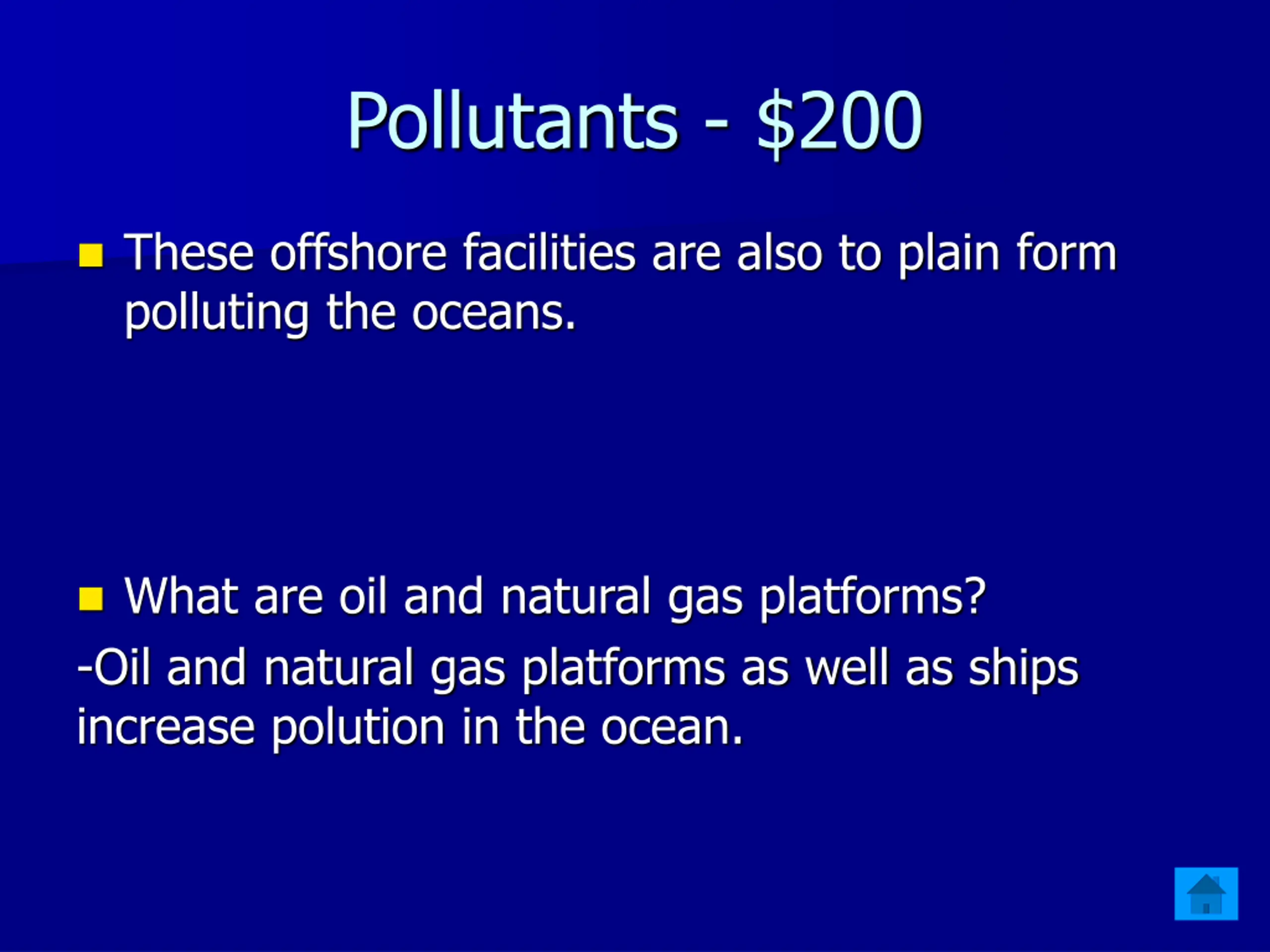 Pollutants - $200 These offshore facilities are also to plain form polluting the oceans. What are oil and natural gas platforms? -Oil and natural gas platforms as well as ships increase polution in the ocean.